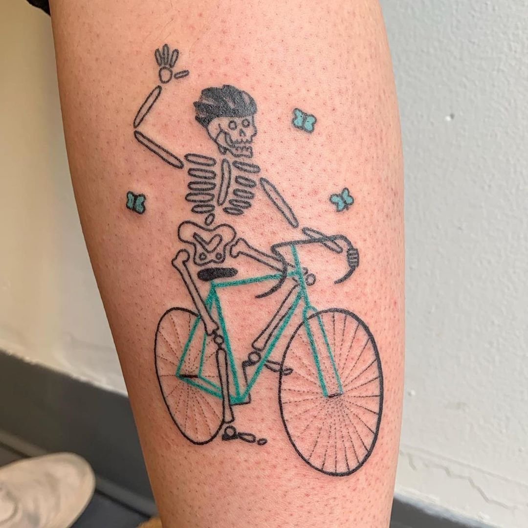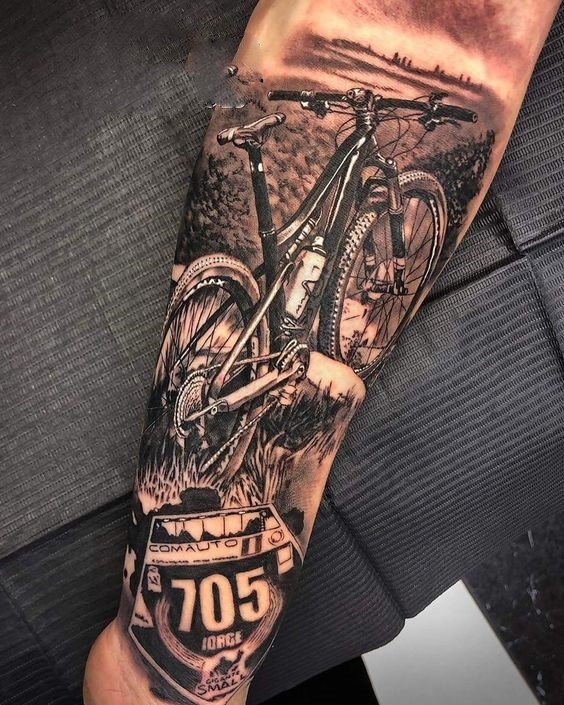 In diesen Stil passt das Fahrrad perfekt, da es alle geometrischen Details in seiner Komposition aufweist. Die Größe des Tattoos hängt von dem Körperteil ab, auf den Sie das Tattoo auftragen. Zweifellos hängt die Größe auch vom Kunden und dem Umfang der Arbeit ab: Vielleicht wird die Fahrradskizze nur eine bestehende Tätowierung auf dem Körper ergänzen und das erste Element sein, das angebracht wird, während das Design später breiter und reicher mit anderen Details und Objekten wird.