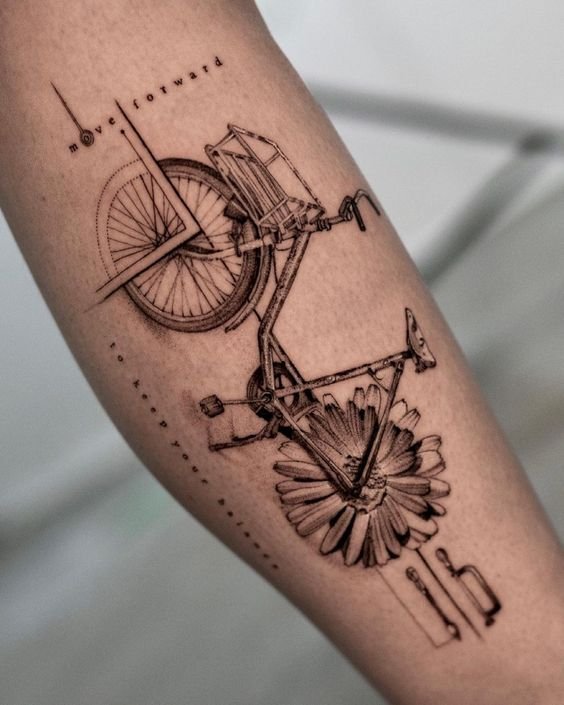 Eine weitere Bedeutung des Fahrradsymbols ist die Vorwärtsbewegung. Denn auf dem Fahrrad kann in den meisten Fällen außer der Vorwärtsbewegung nichts getan werden. Es weist also auf die Entschlossenheit und Standhaftigkeit einer Person hin. Der Träger des Fahrradtattoos hat sich für seinen Lebensweg entschieden und bewegt sich auf ihm vorwärts. Das Fahrrad ist ein Fahrzeug mit geringer Geschwindigkeit, denn das Fahrrad sagt auch, dass sich der Mensch langsam, aber sicher vorwärts bewegt, unerschütterlich Schritt für Schritt voranschreitet.