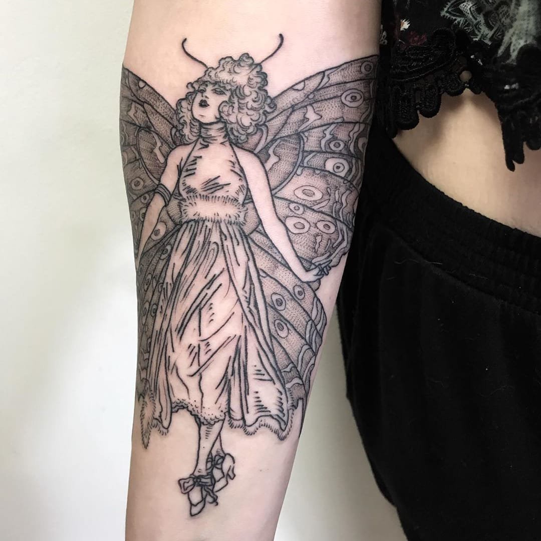 Häufigstes und geeignetes kleines bis mittelgroßes Tattoo. Sie zeigen auf dem Körper in der Regel eine elegante junge Frau mit schönen und feinen Flügeln, immer mit lockerem und lockigem Haar, gekleidet in einer schönen Kleidung mit einem kurzen Kleid oder Rock.