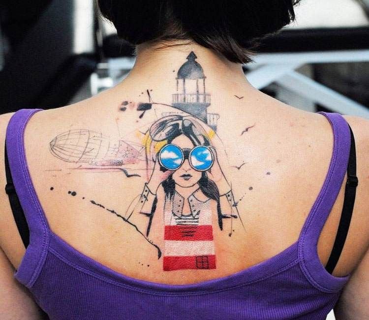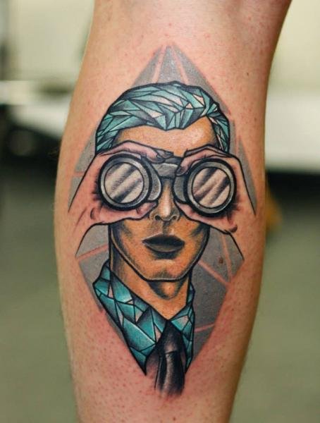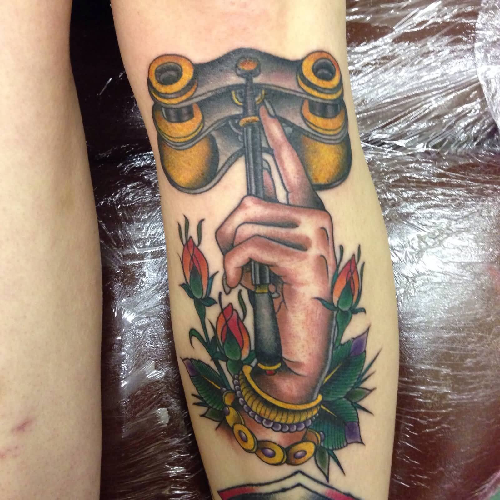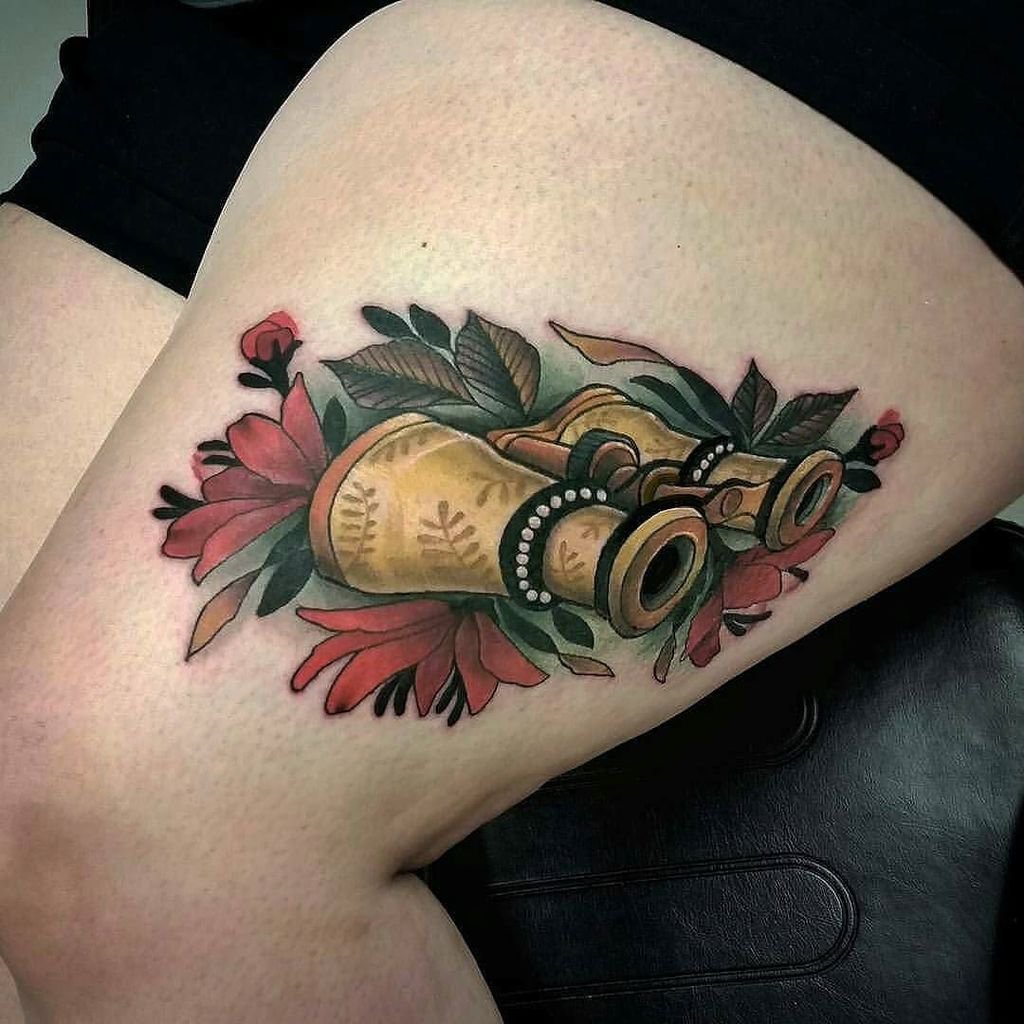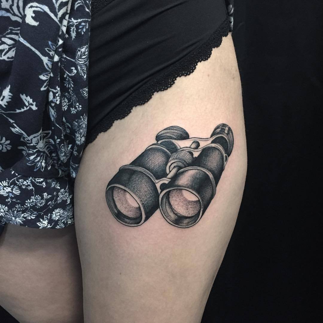Darüber hinaus kann das Fernglas Teil des Gesamtbildes der Tätowierung sein, die auf die Haut aufgetragen wird. Es kann ein Theater-Fernglas sein, das die Figur einer Frau oder eines Mannes ziert, es kann sich am Hals oder in den Händen befinden.