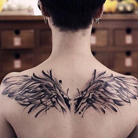 Normalerweise werden die Flügel in einem realistischen Stil dargestellt, aber Sie können nach Belieben einen anderen bevorzugten Stil auswählen. Zum Beispiel, Flügel im Stil von Trash Polka sehen sehr eindrucksvoll aus. Diese Art von Tätowierung eignet sich für Menschen, die Modestandards herausfordern. Doch die Flügel im Aquarellstil eignen sich eher für kreative Persönlichkeit. Egal welche Version der Flügel Sie gewählt haben, wählen Sie auf jeden Fall eine unglaublich schöne Körperdekoration, deren Beachtung garantiert ist.