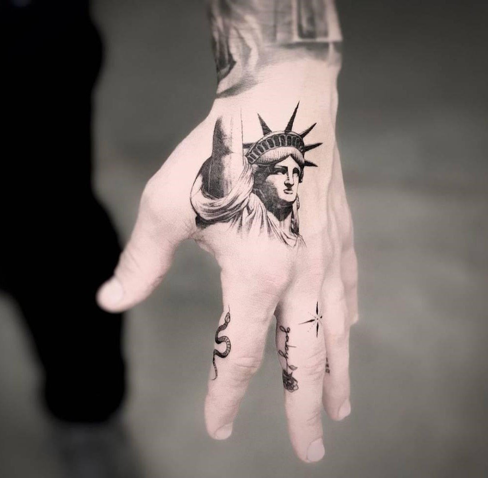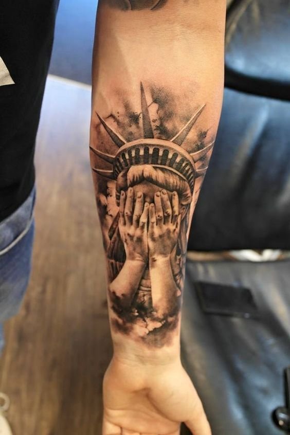 - Die Skizze der Freiheitsstatue, die den Unterarm schmückt, charakterisiert ihren Besitzer als eine Person ehrlich, friedliebend, fair und gewissenhaft.