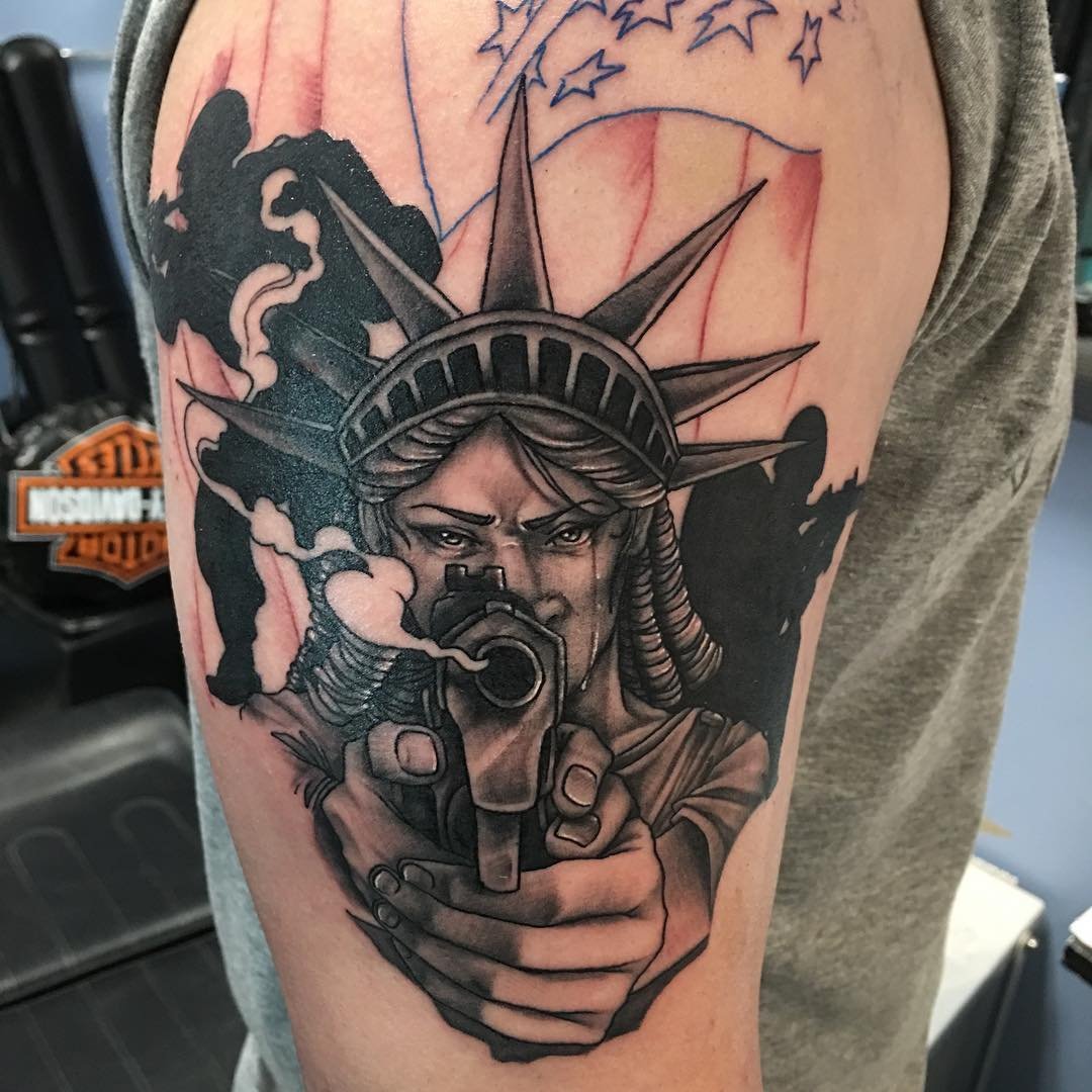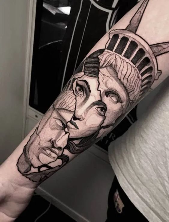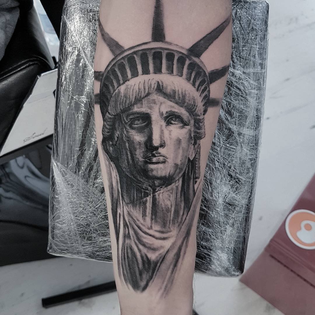 Das Tattoo der Freiheitsstatue sieht auf großen Körperflächen wie dem Rücken, dem Unterarm, der Brust und dem Oberschenkel spektakulär aus.
