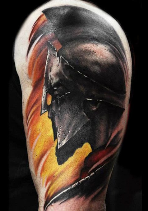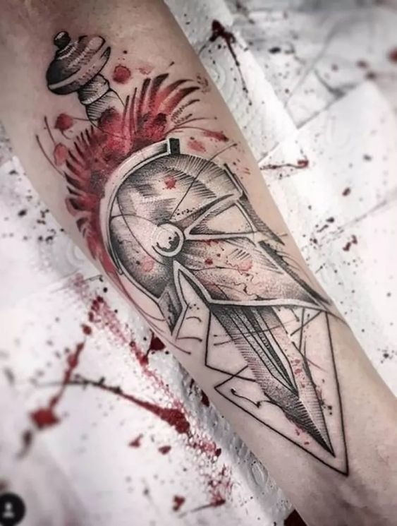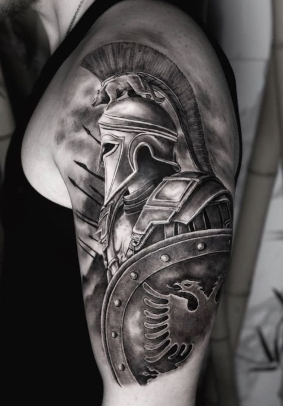 Oft nicht das Bild des Gladiators, sondern seine Rüstung wird für das Tattoo ausgewählt: Rüstung, Helm, Kampfwaffe.