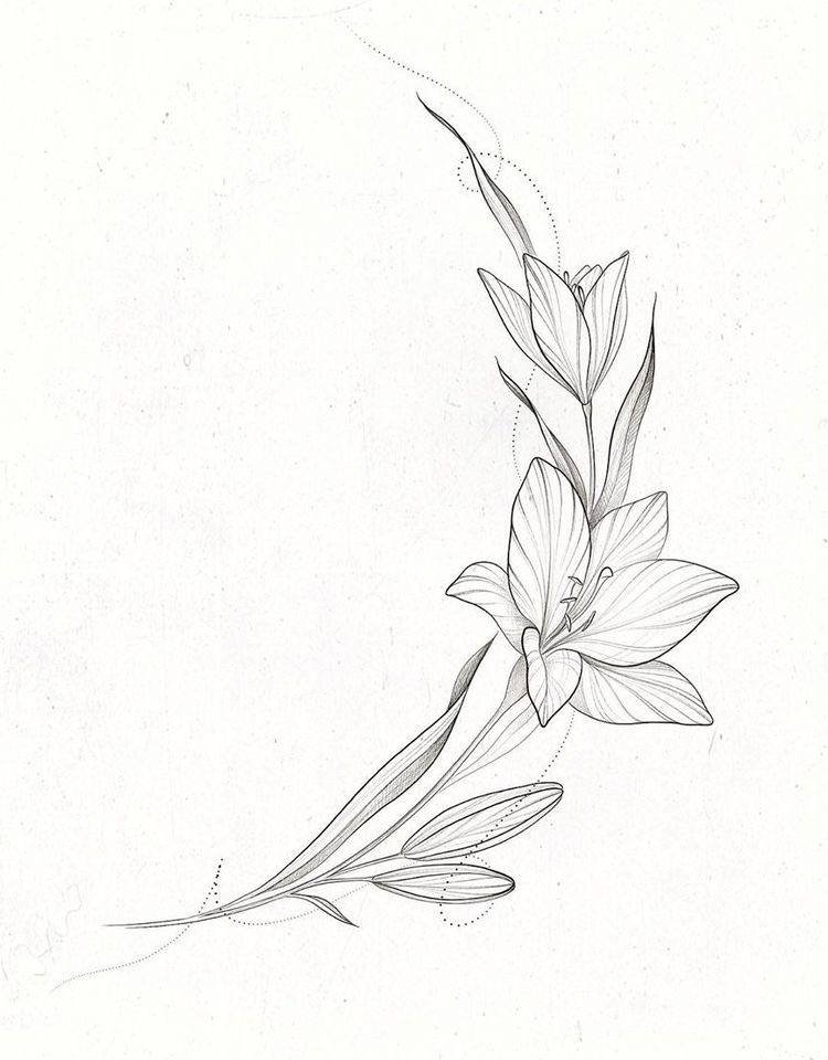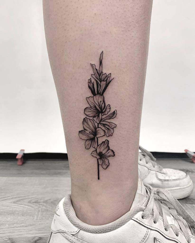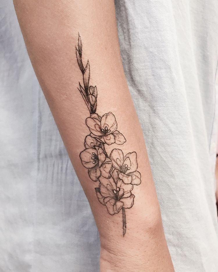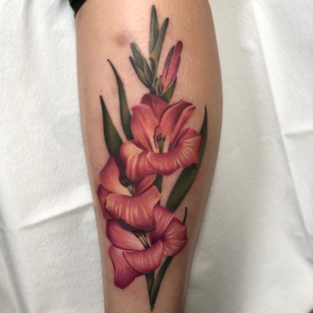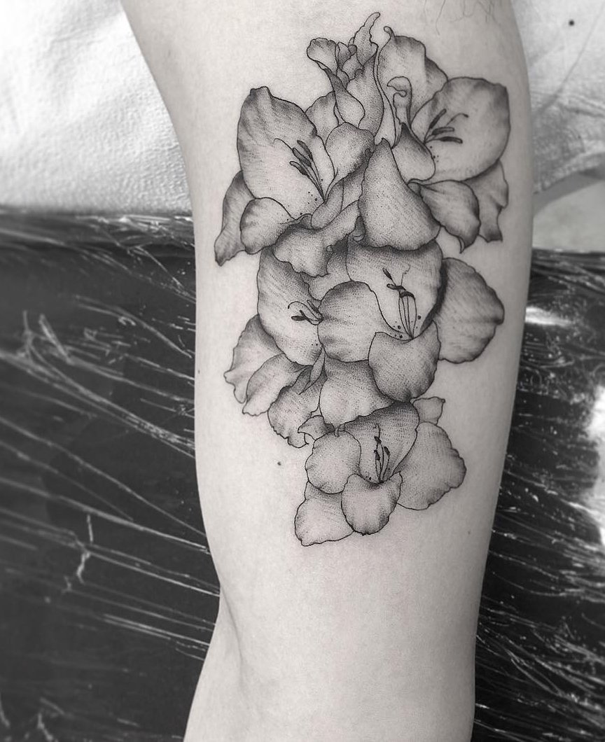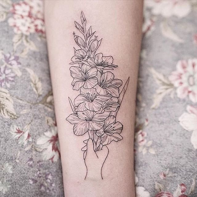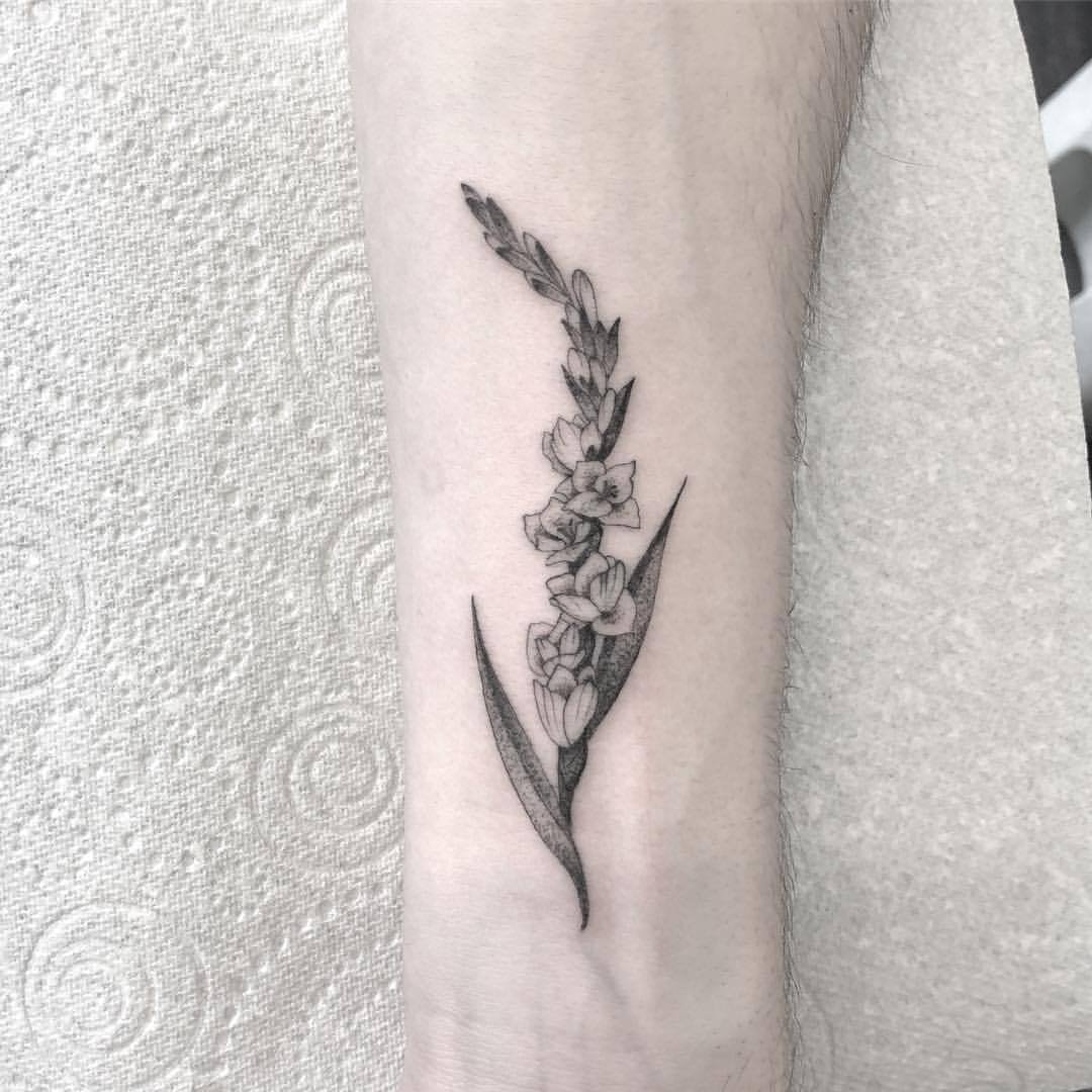 Besonders Frauen lieben es, ihren Körper mit Bildern von Rosen, Pfingstrosen, Tulpen und anderen Blumen zu schmücken. Eines der beliebtesten floralen Tattoos ist das Bild von Gladiolus, das sehr farbenfroh und spektakulär aussieht. Diese Blume ist voller Zärtlichkeit und Anmut, aber sie trägt trotzdem eine ziemlich tiefe Bezeichnung. Der Name dieser zarten Blume in Latein wird mit dem Wort Schwert übersetzt.