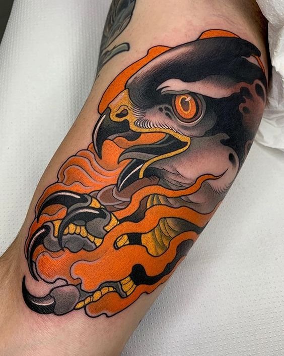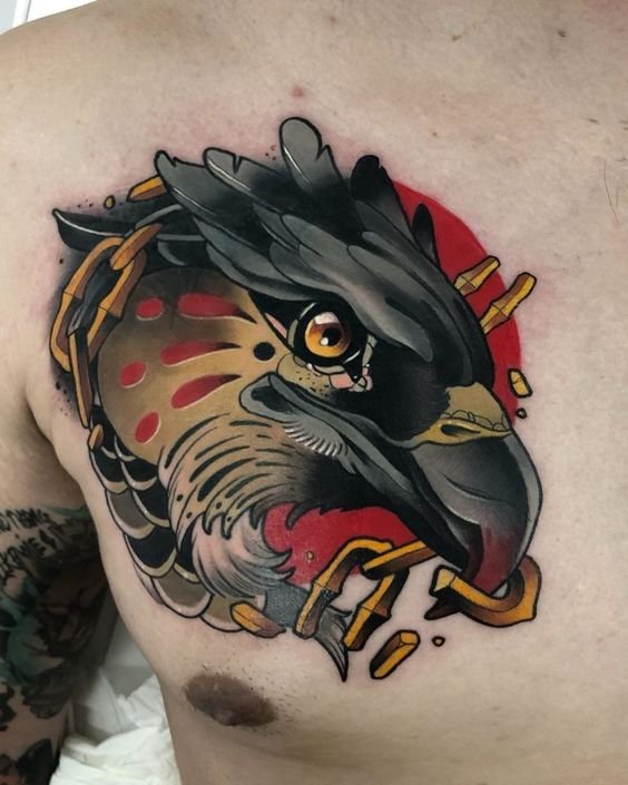 Neben seiner Bedeutung ist eine hochwertige Tätowierung eines Falken eine gute Möglichkeit, die Männlichkeit des Trägers zu betonen. Am auffälligsten ist die Tätowierung in einem realistischen Stil.