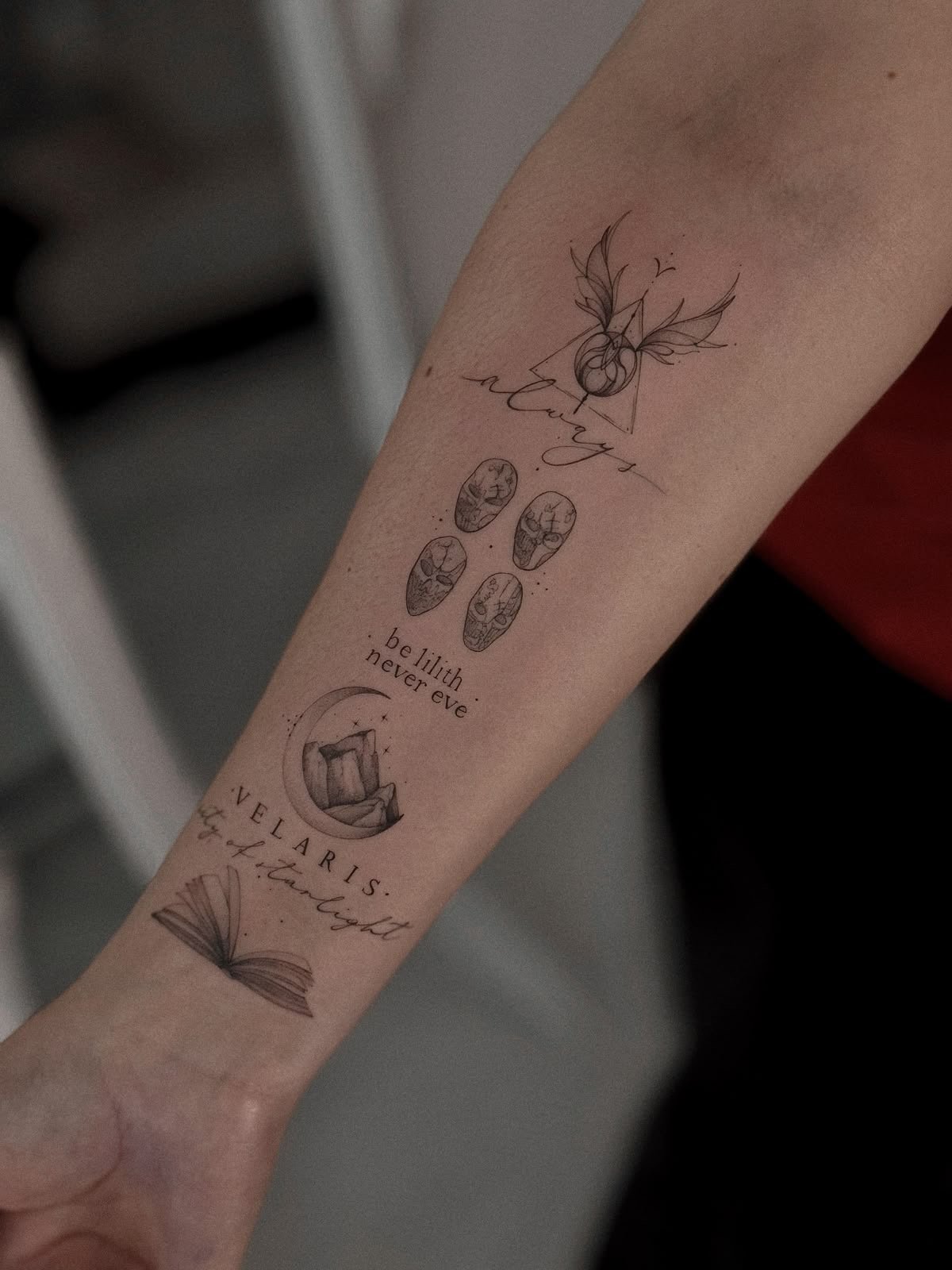 Ein Harry Potter Tattoo am Arm ist besonders beliebt – hier lassen sich sowohl feine Schriftzüge als auch komplexe Szenen hervorragend platzieren. Auf dem Unterarm wirken längliche Motive elegant, während der Oberarm Platz für größere Kompositionen bietet.