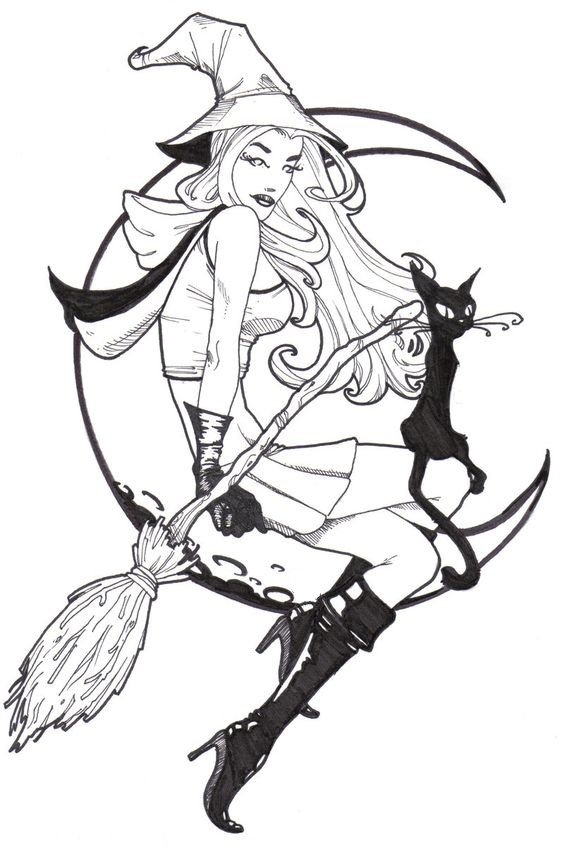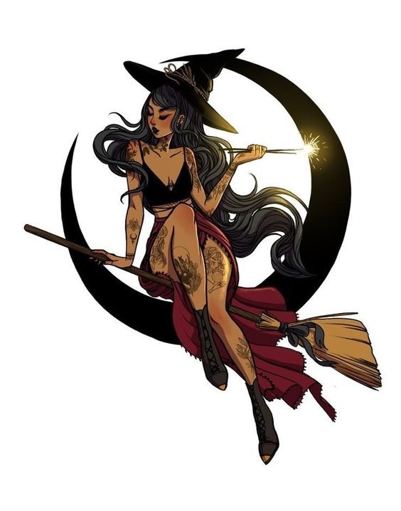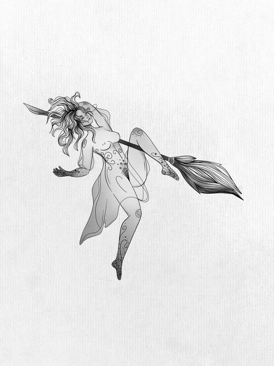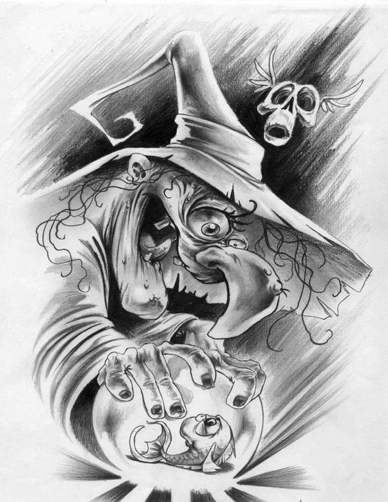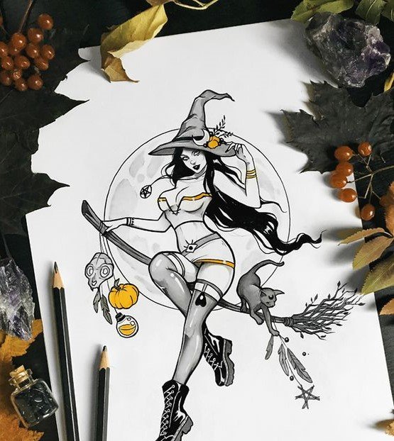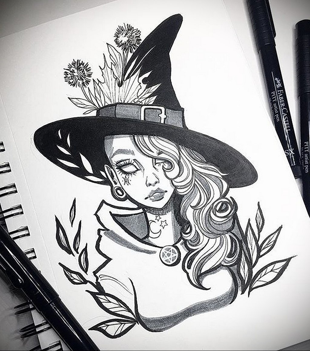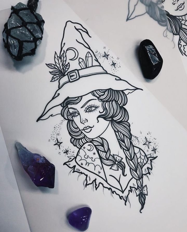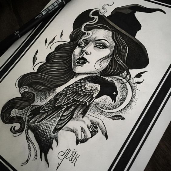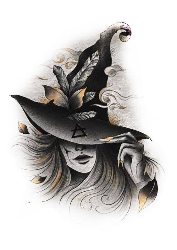 Die Skizze einer Hexen kann ein vollwertiges Tattoo sein und verschiedene Elemente enthalten.