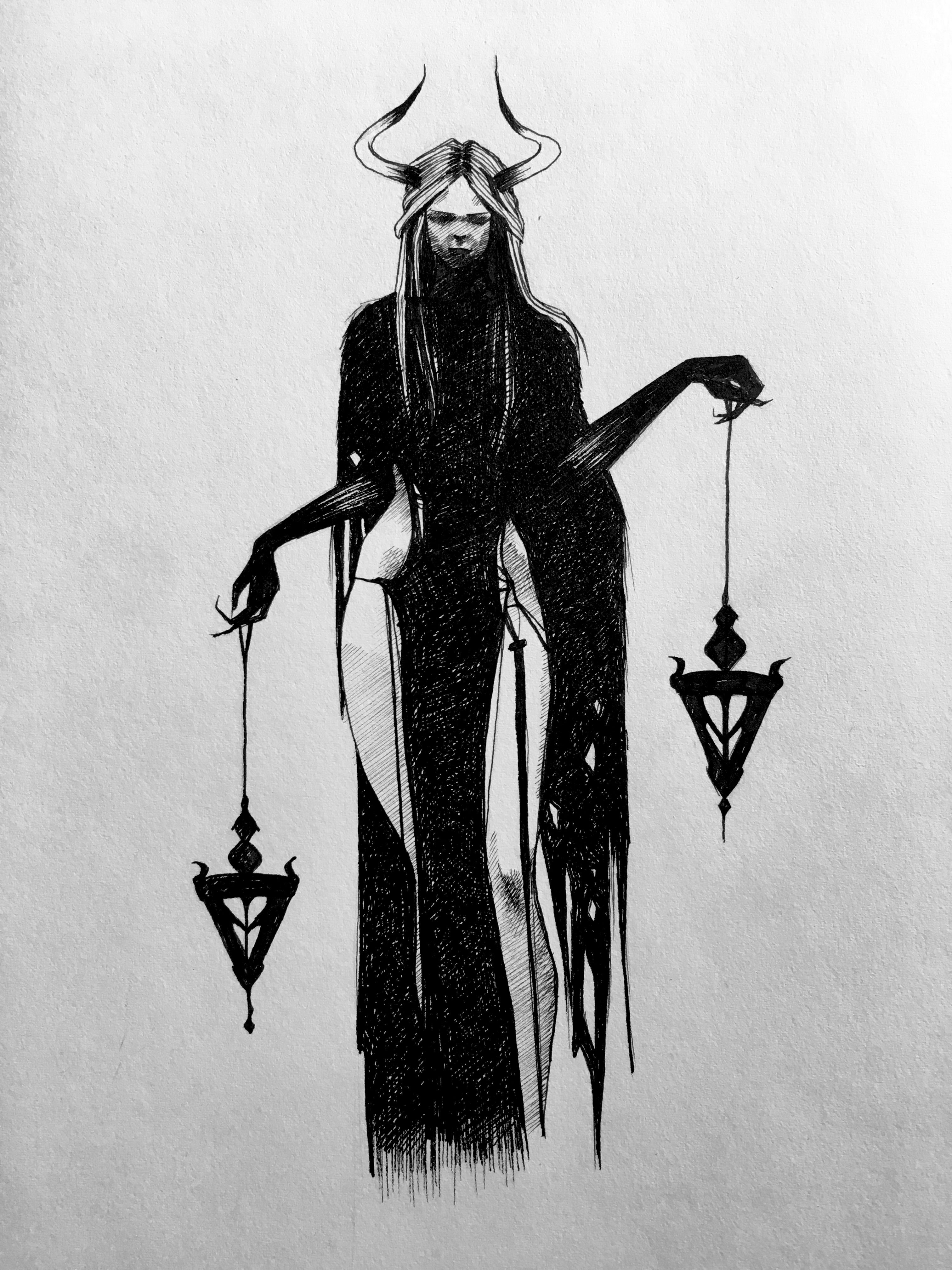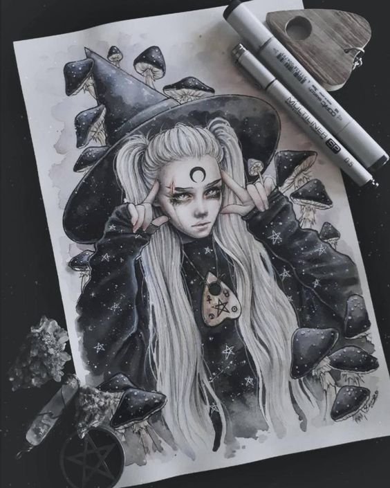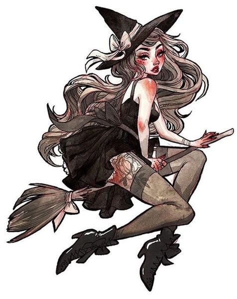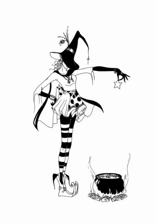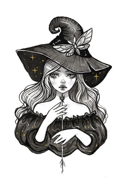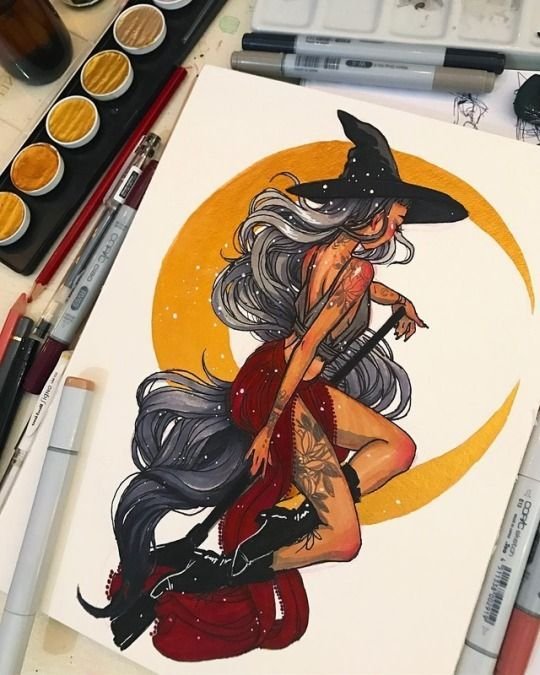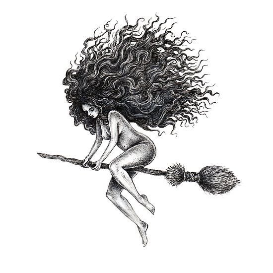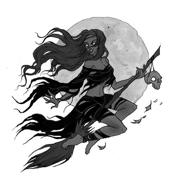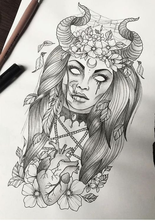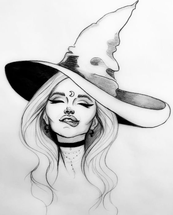 Die Skizze einer Hexen kann ein vollwertiges Tattoo sein und verschiedene Elemente enthalten.