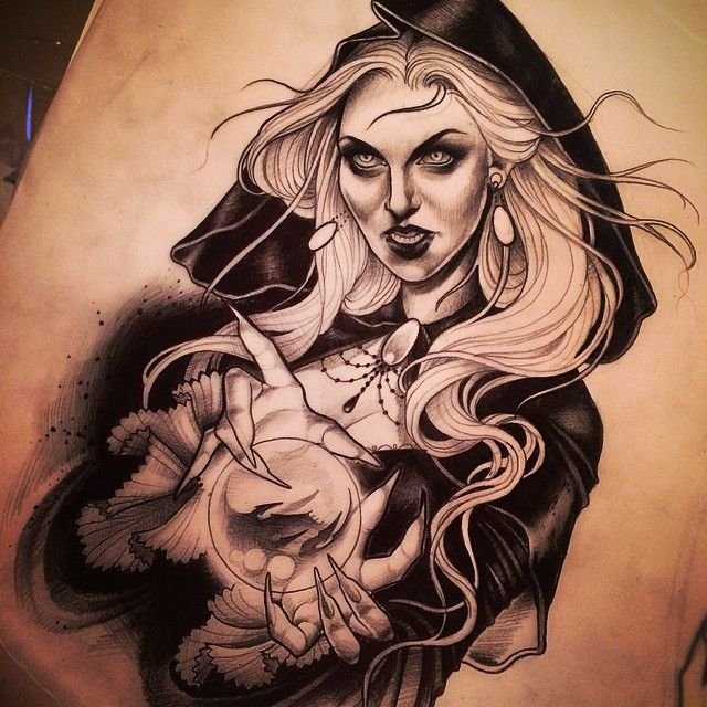 Auf der einen Seite bedeutet die Zauberin die dunkle Seite, mystische Kraft und Wut. Und die Schönheit der Hexen zeigt, wie stark ihre Magie und List ist. Auf der anderen Seite trägt ein Tattoo mit einer Hexen die Bezeichnung Weisheit und Wissensfülle.