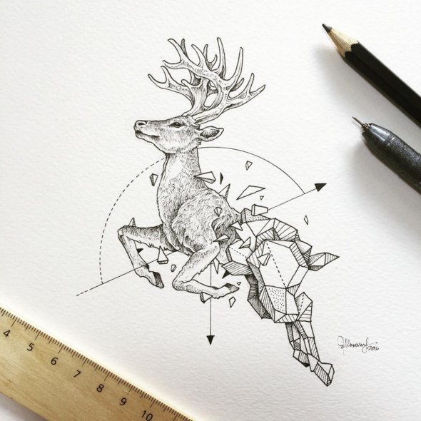 Ein Hirsch Tattoo kann in jedem Stil und in jeder Richtung ausgeführt werden, es kann ein realistisches Bild, abstrakt, geometrisch, Aquarell usw. sein. Kann die Kombination einiger Stile beinhalten, während die Zeichnung sehr originell und einzigartig aussieht. Diese Figur auf dem Körper wird von Personen beiderlei Geschlechts gewählt, Männer wählen natürlich das Bild eines männlichen Hirsches und Frauen, ein Weibchen oder ein Rehkitz. Das Bild kann ein Hirsch in voller Länge in seiner ganzen Pracht sein oder vielleicht das Bild seines Kopfes, alles hängt von der Stelle ab, an der die Zeichnung angebracht wird, und von den Wünschen des Kunden.