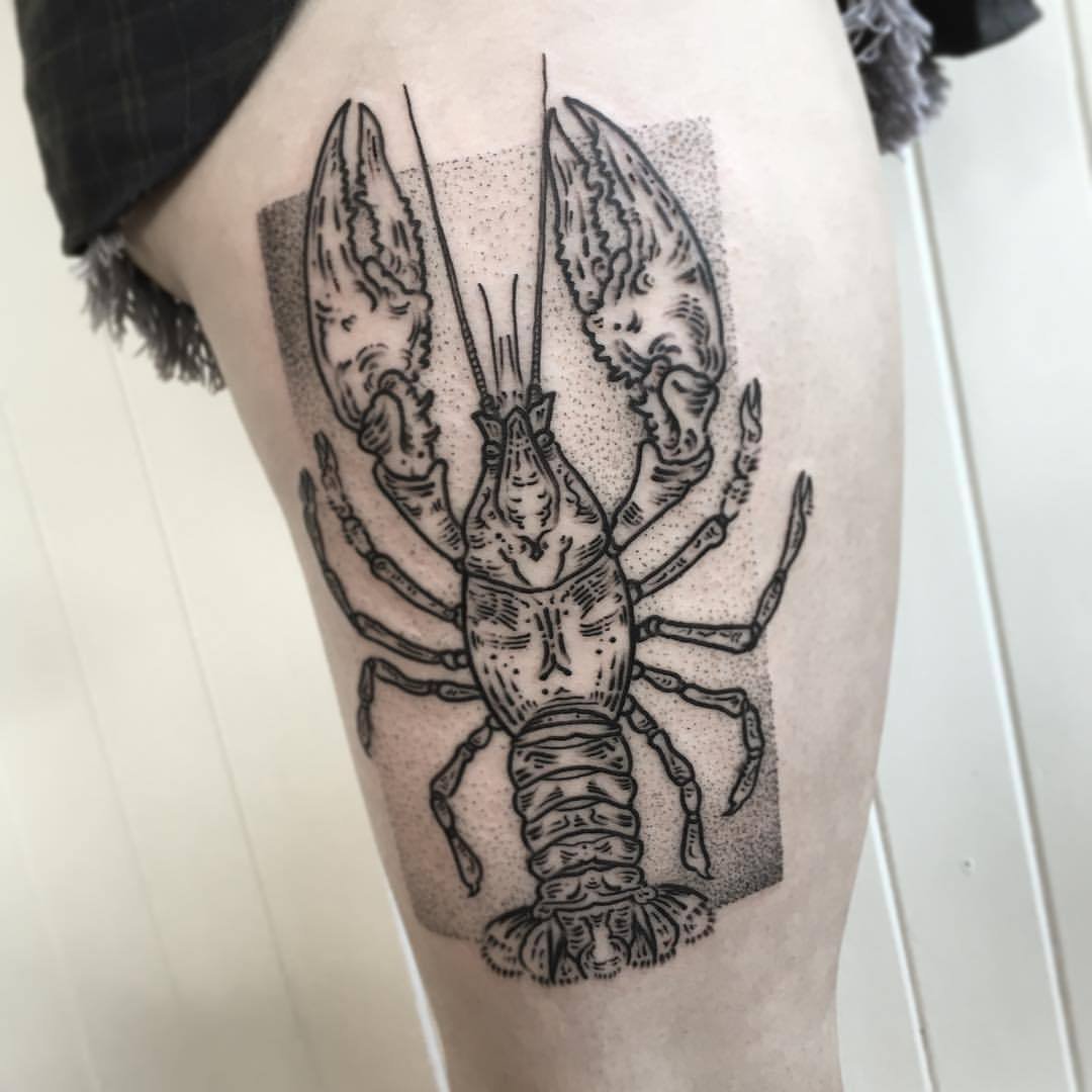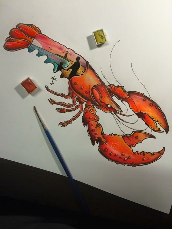 Meistens werden die mit Hummer verbundenen Arbeiten in fröhlichen und hellen Farben ausgeführt. Tattoo-Optionen in Schwarz und Weiß sind auch modisch, da es in jedem der vorhandenen Stile durchgeführt werden kann. Das Bild kann in einem beliebigen Winkel gezeichnet werden.