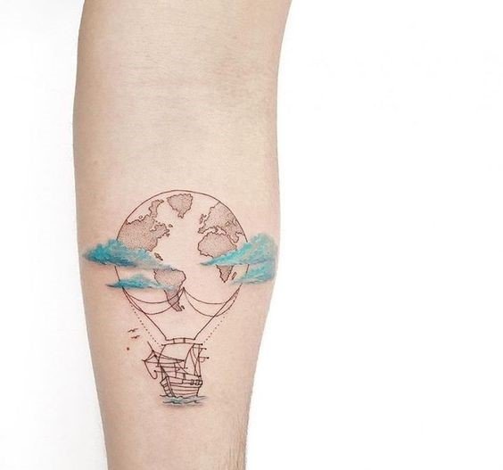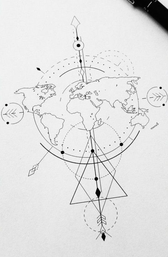 Sie können verschiedene Elemente zu Ihrer Weltkarte hinzufügen, um sie zu gestalten. So kann beispielsweise ein symbolischer Berg im Hintergrund der Weltkarte zu sehen sein oder ein Mann, der am Anfang seiner Reise steht. Letzteres hat eine etwas andere Bedeutung, die von einem jungen Menschen spricht, der sich auf den Weg ins Leben macht. Wenn Sie in eine andere Stadt oder ein anderes Land gehen, kann der Student die Arbeit eines solchen Plans auf seiner Haut hinterlassen, als Erinnerung an die Heimat.