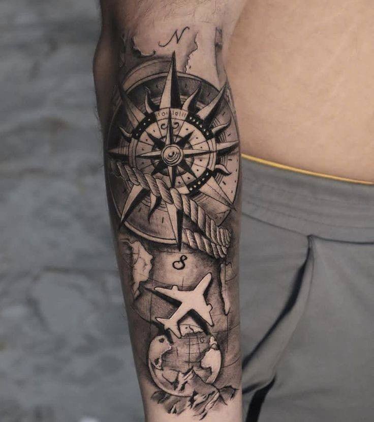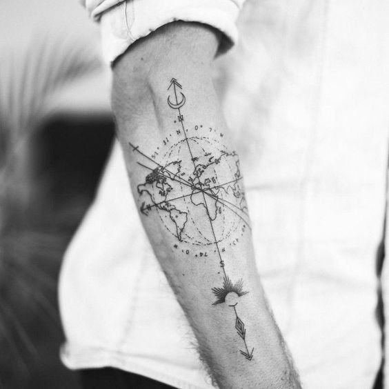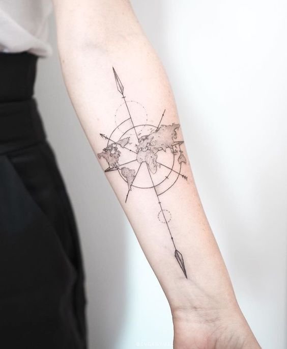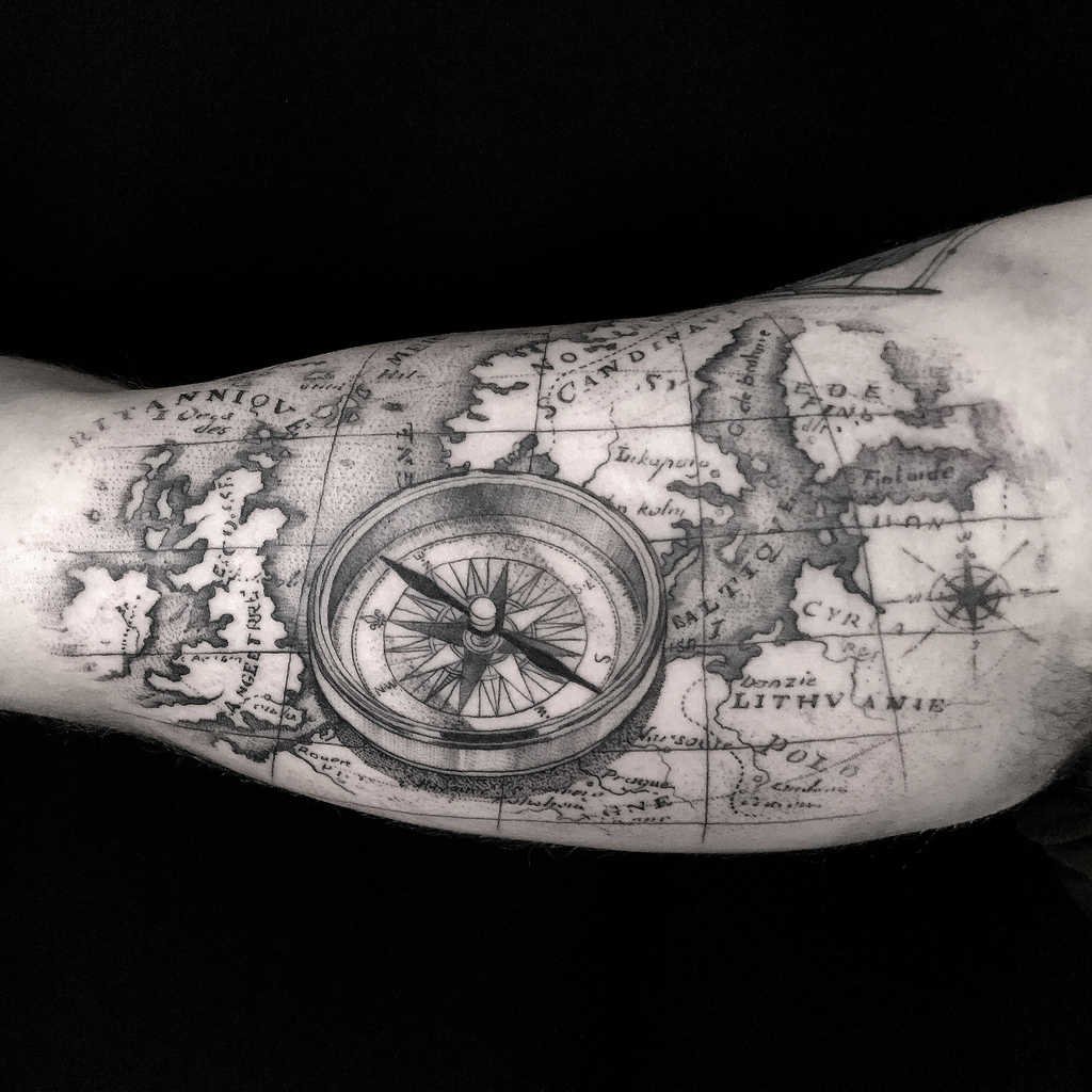 Für den Seemann ist die Weltkarte nicht weniger wichtig. Aber in seinem Fall kann es sein, Land zu finden oder zu fehlen, eine Weltkarte der Tiefe des Meeres oder des Ozeans zu sehen, um nicht gestrandet zu werden, es ist der Weg nach Hause. Eine Tätowierung auf einer Weltkarte kann die schwierigste und längste Route zeigen, die ein Seemann zurücklegen konnte, oder alle Seewege markieren, die er auf dem Weg zurückgelegt hat. Es ermöglicht Ihnen, Ihren Standort zu markieren und den Weg nach Hause zu wählen, damit Sie sich nicht in den Tiefen des Meeres verirren.