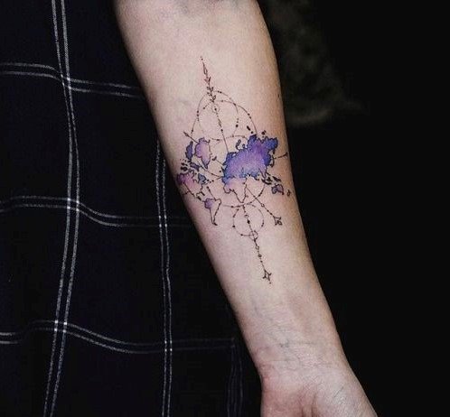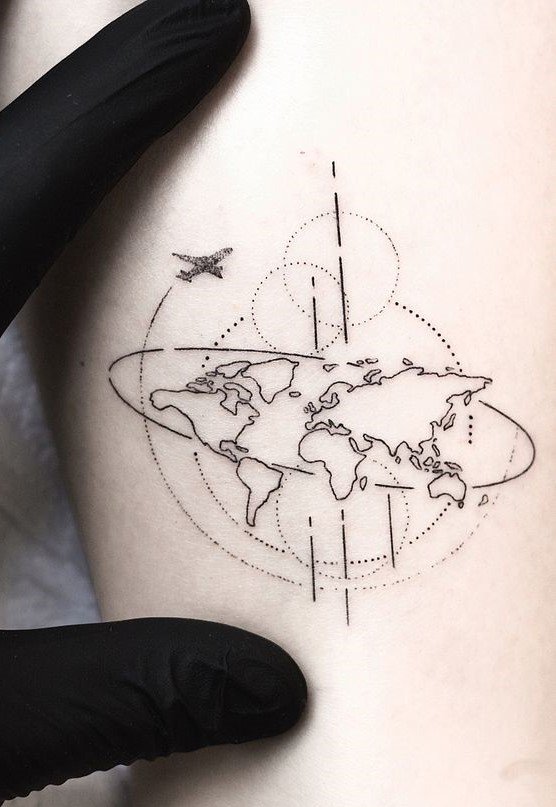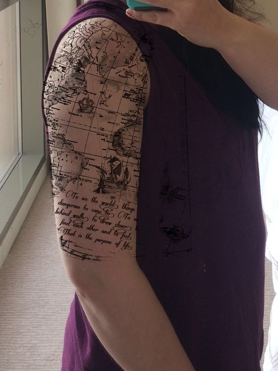 Ein Tattoo kann eine Weltkarte Ihrer Lieblingsstadt bezeichnen, die von Anfang bis Ende lang und quer geführt wird.