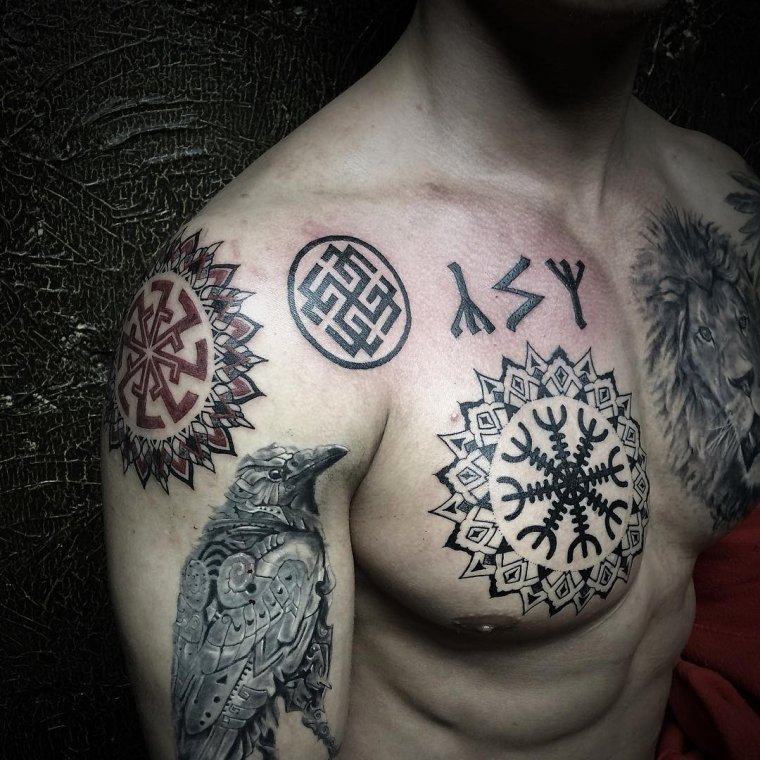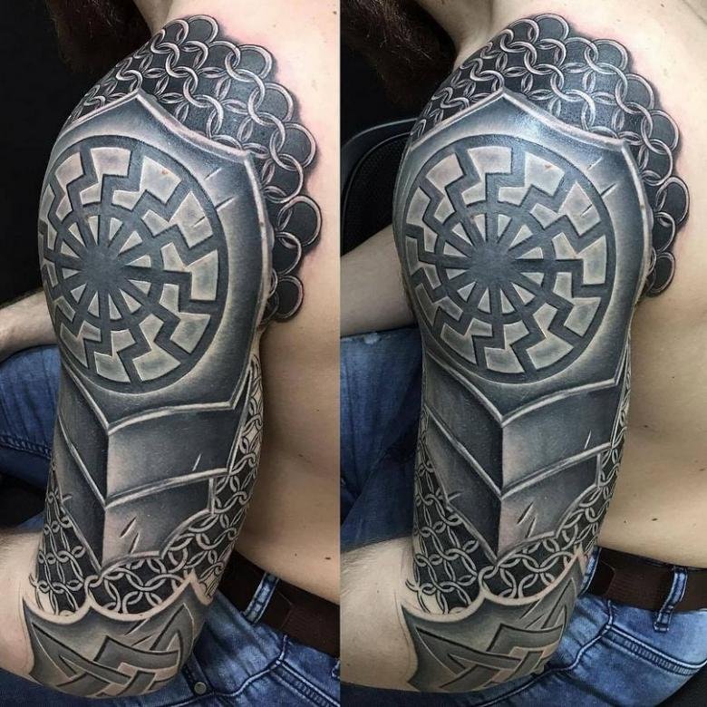Kolovrat sieht an jedem Körperteil gut aus, sei es am Handgelenk, an der Schulter, am Hals oder an der Brust. Bei der Auswahl eines Körperteils zum Auftragen eines Kolovrat-Tattoos gibt es keine Einschränkungen. Wenn Sie selbst nicht entscheiden können, wo Sie ein Tattoo mit Kolovratom stopfen, konsultieren Sie einen Spezialisten. Der Meister wird Ihnen sagen, auf welchem Teil Ihres Körpers kolovrat Tattoo wird so effektiv wie möglich aussehen.