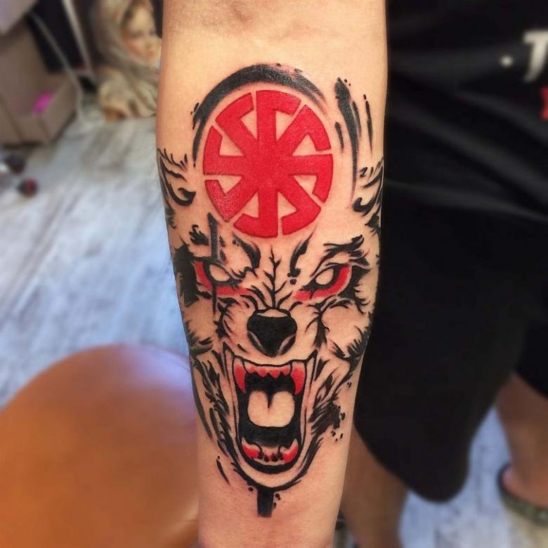 In der Regel wird das Kolovrat-Tattoo in Schwarz ausgeführt, aber es gibt oft auch Kolovratas in Rot, Weiß oder feuerroter Farbe.