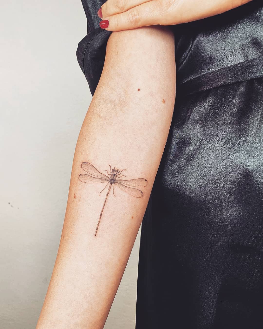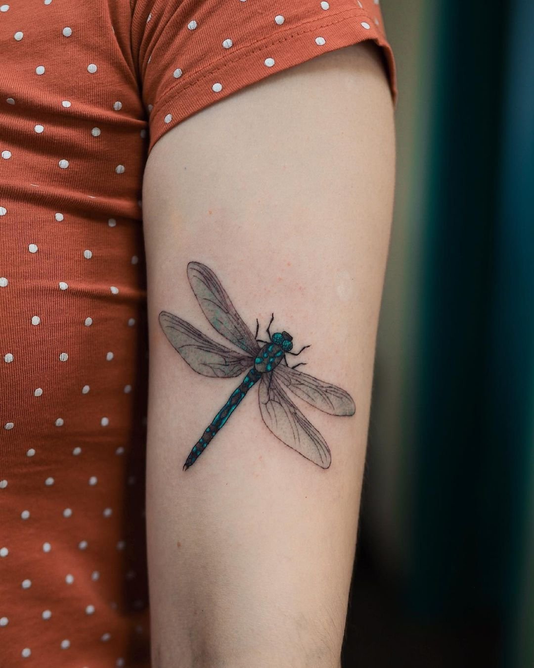 Das Libellen-Tattoo kommt am besten im realistischen Stil zur Geltung, wobei die Details besonders betont werden. Für Männer unterstreicht es ihre Stärke, während es für Frauen ein Symbol für feminine Anmut und Zärtlichkeit darstellt.