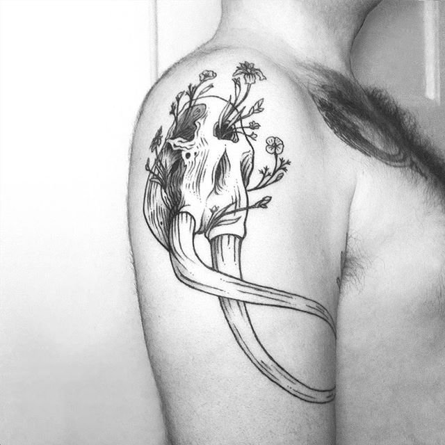 Auch Jäger mögen Tier-Tattoos. Früher sammelten sie Trophäen, um ihren Beruf zu kennzeichnen. Jetzt, da ein Monster wie das Mammut ausgestorben ist, kann eine Trophäe in Form einer Trophäe tätowiert werden. Dies wird dem Jäger Glück bei der Jagd bescheren. Das Werk wird den Körper mit einer Zeichnung schmücken, auf der das gejagte Tier abgebildet ist.