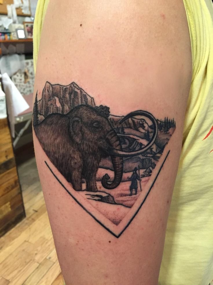 Wählen Sie einen Stil, in dem die Arbeit maximal Ihren Vorlieben entspricht, so dass sie zu den zuvor aufgetragenen Tattoos passt. Sie können eine Komposition aus mehreren Tieren machen, von denen jedes mit seinem Geschäft beschäftigt ist, zum Beispiel in der Nähe eines Flusses oder in einer Ebene mit Pflanzen. Interessant für viele wird die Version des Mammuts mit einem Jäger darauf sein, der das Tier besiegt und erobert hat. Hier wird die Bedeutung etwas anders sein: Wir sprechen von Unterdrückung, Eroberung von etwas oder jemandem, oft sprechen wir von der Person selbst. Der Sieg kann zum Beispiel über negative Eigenschaften, schlechte Gewohnheiten oder schweres Gewicht liegen.