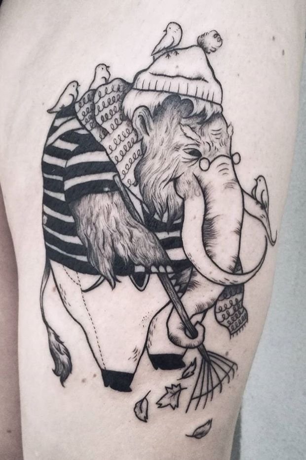 Das Bild eines Mammuts kann genau die Größe des Menschen selbst bedeuten. Oftmals fällt die Wahl genau auf das Volumen des Tieres, auf seine enorme Größe. Wenn sich eine Person mit einem Elefanten verbindet, ist auch ein Mammut-Tattoo durchaus geeignet.