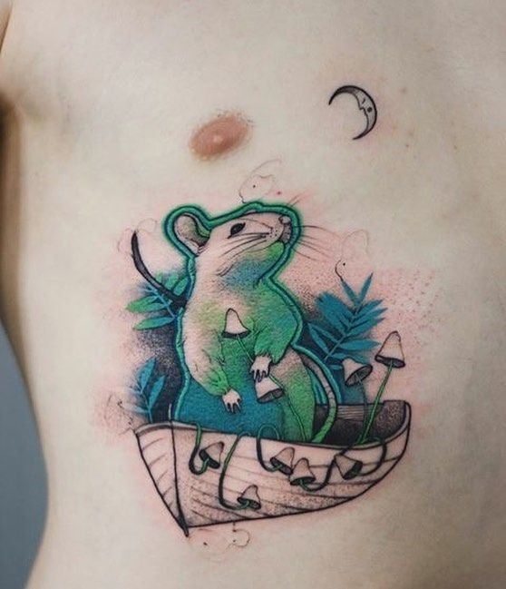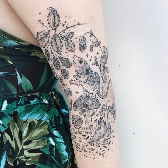 Für verstecktere Bereiche wie den Unterbauch könnte das Maus-Tattoo auch Teil einer größeren Geschichte oder Szene sein. Zum Beispiel könnte die Maus in einer Wiesenlandschaft mit Blumen und Schmetterlingen platziert werden, um eine stimmungsvolle Atmosphäre zu schaffen. Oder sie könnte von einem Raum oder einer Galaxie umgeben sein, um eine surreale und kreative Note zu verleihen.