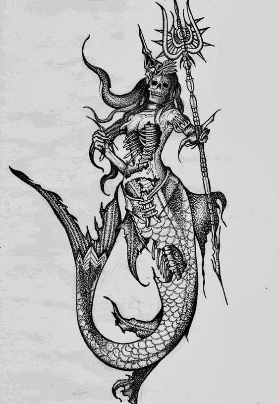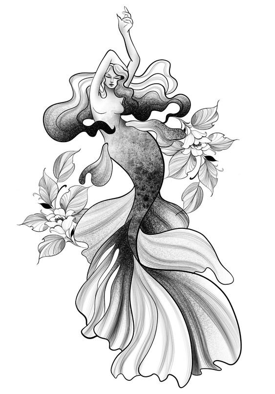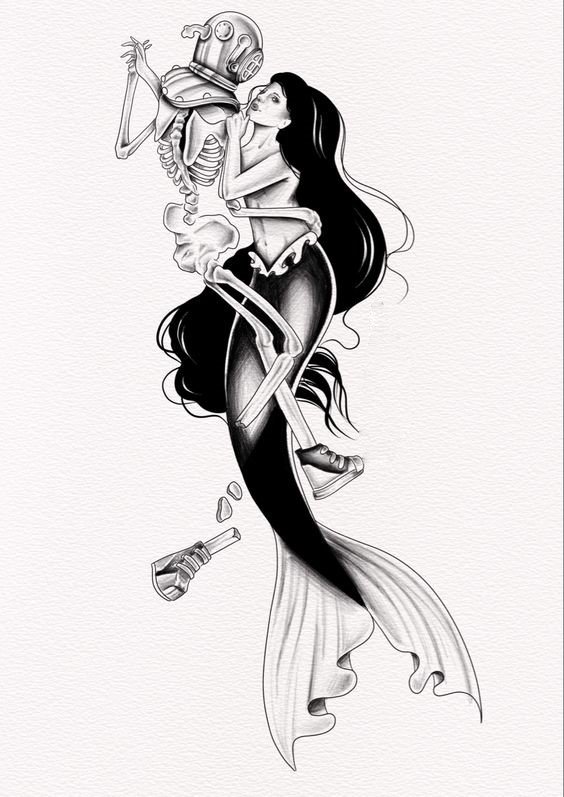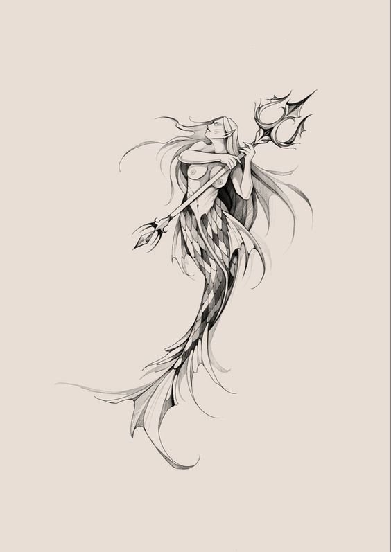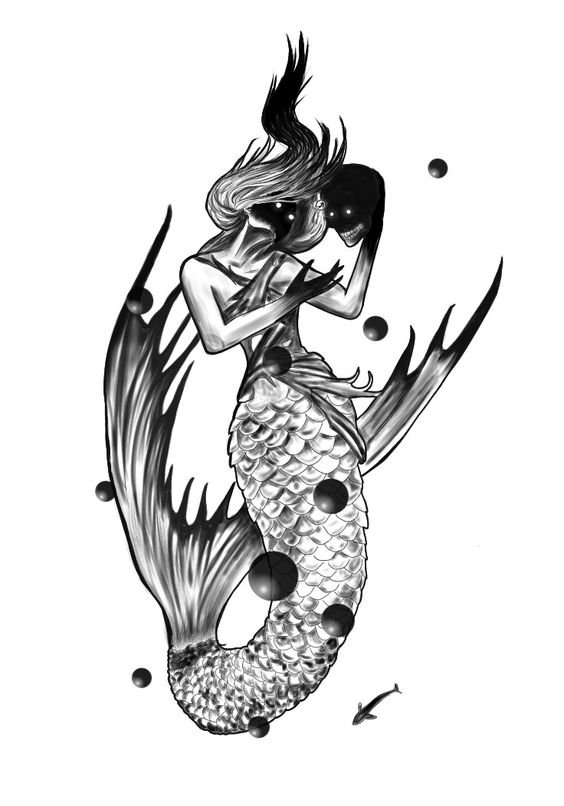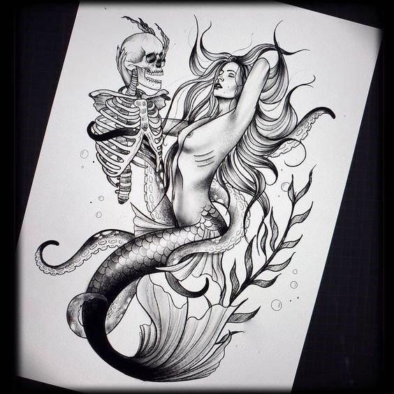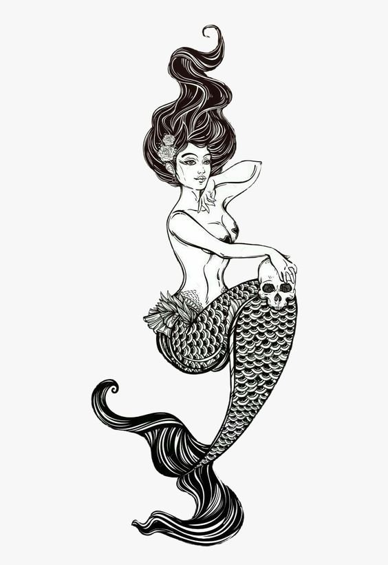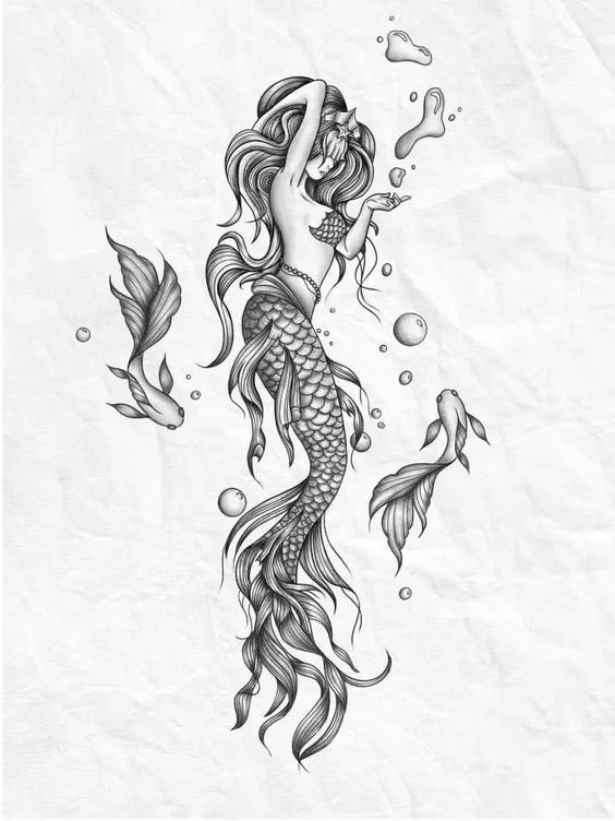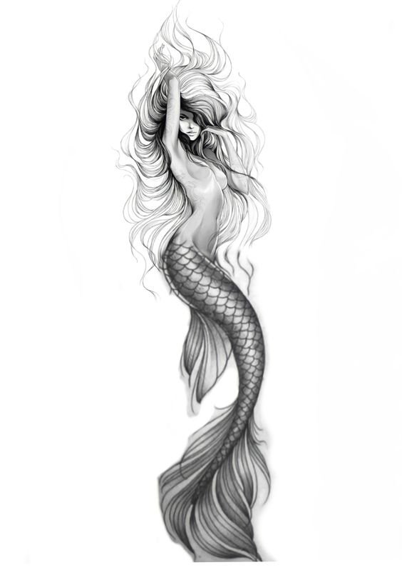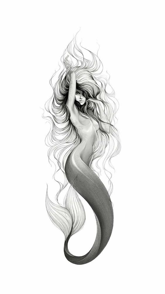 Tattoo Skizze Meerjungfrau trägt weibliche Energie, gefährliche Schönheit, Sexualität, Faszination und Göttlichkeit.