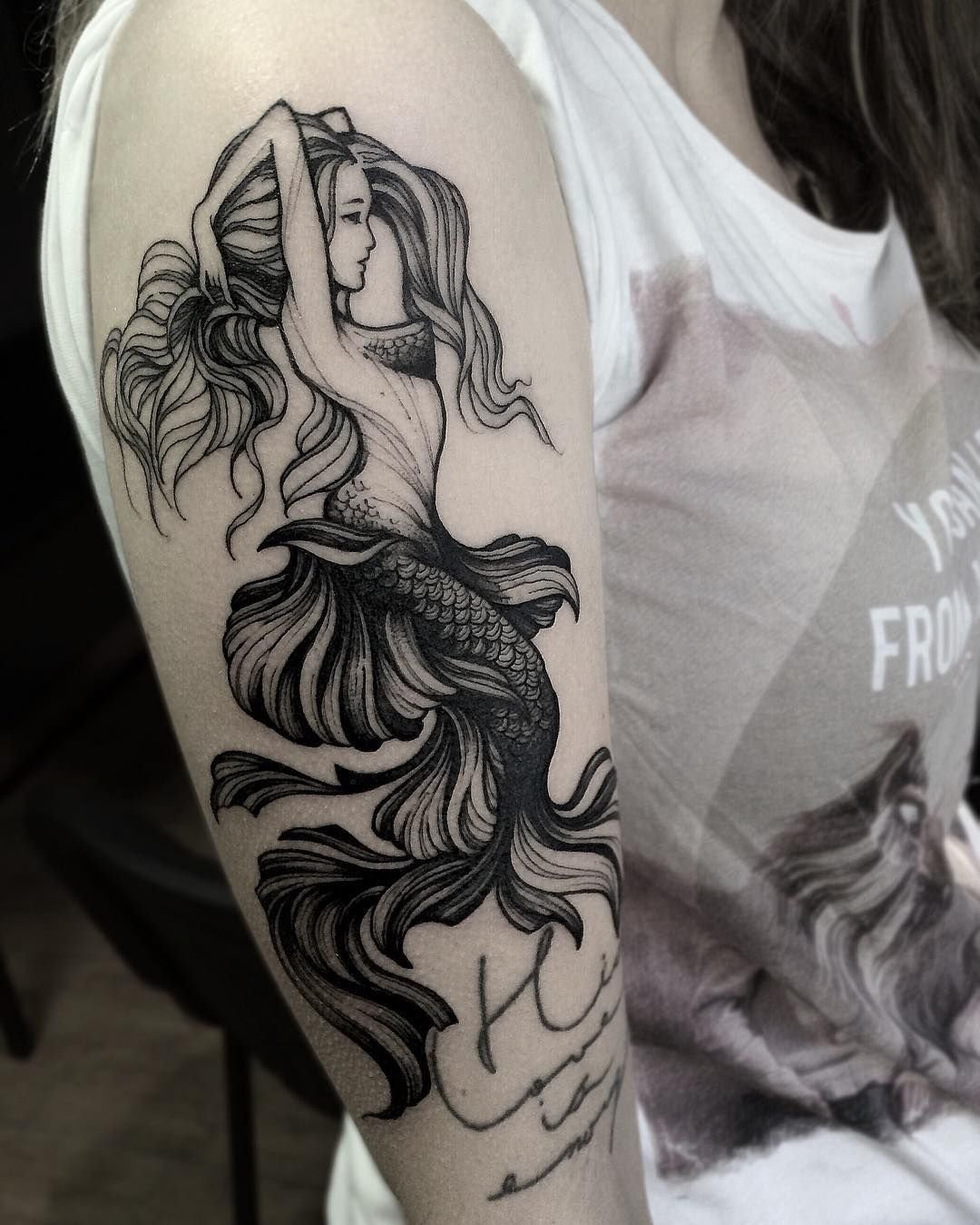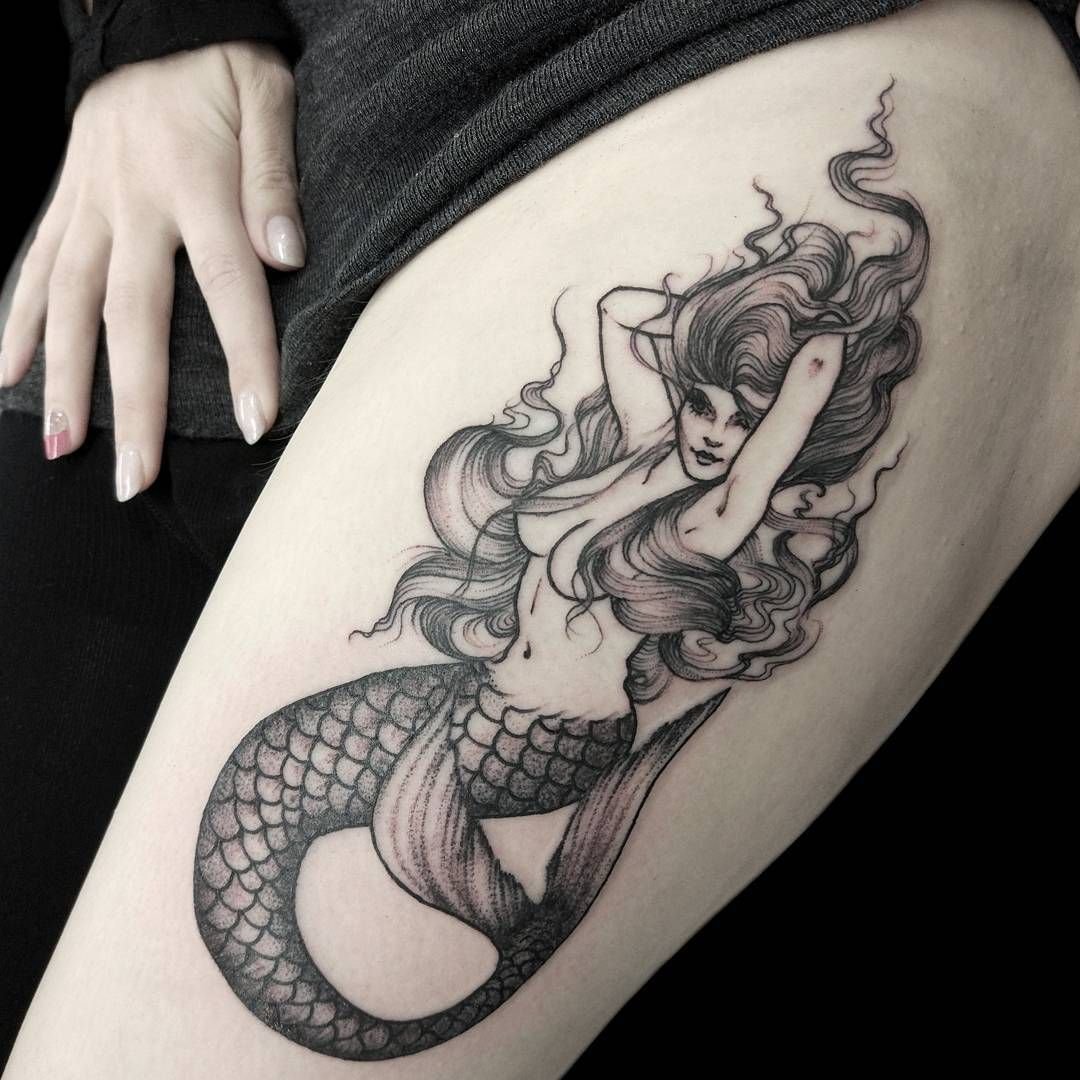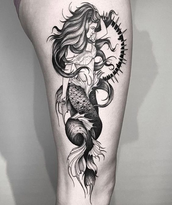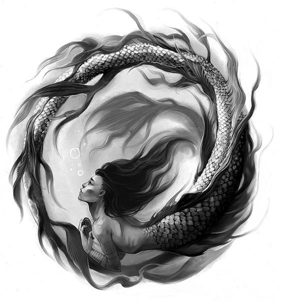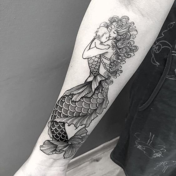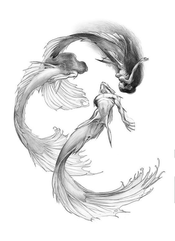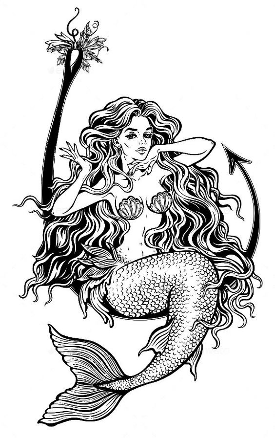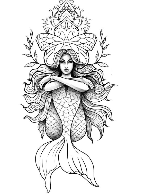 Tattoo Skizze Meerjungfrau trägt weibliche Energie, gefährliche Schönheit, Sexualität, Faszination und Göttlichkeit.