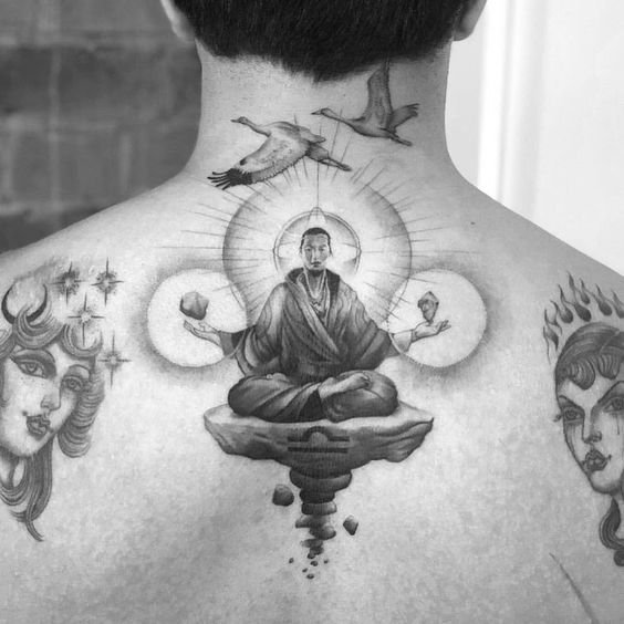 Ein Mönch ist häufig eine gerechte Person, die Gott dient und sein Leben dem Studium seiner Gebote gewidmet hat. Er führt dabei einen asketischen Lebensstil, unabhängig von der Religion, die ihn motiviert. Oft ermöglicht die spezifische Religionszugehörigkeit eine unterschiedliche Interpretation von Tätowierungen. Die Stilrichtung kann der Zeichnung auch eine semantische Bedeutung verleihen, die die Handlung vervollständigt, die Botschaft des Autors hervorhebt und vom Kunden übermittelt wird.