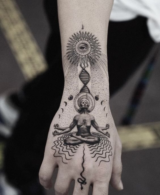 Diese Bedeutung wurde aus Büchern und Spielen übernommen, in denen ein Mönch Ähnlichkeiten mit einem Magier und Zauberer aufweist, da sie alle ähnliche Roben und Attribute tragen. Ihr Gesicht ist oft von einer Kapuze verdeckt, und in ihrer Nähe sind oft Kerzen und Bücher zu sehen. Die mystische Botschaft des Bildes bleibt dem Kunden und dem Besitzer des Tattoos vorbehalten, da jeder Mensch dem Werk seine eigene individuelle Bedeutung beimisst.