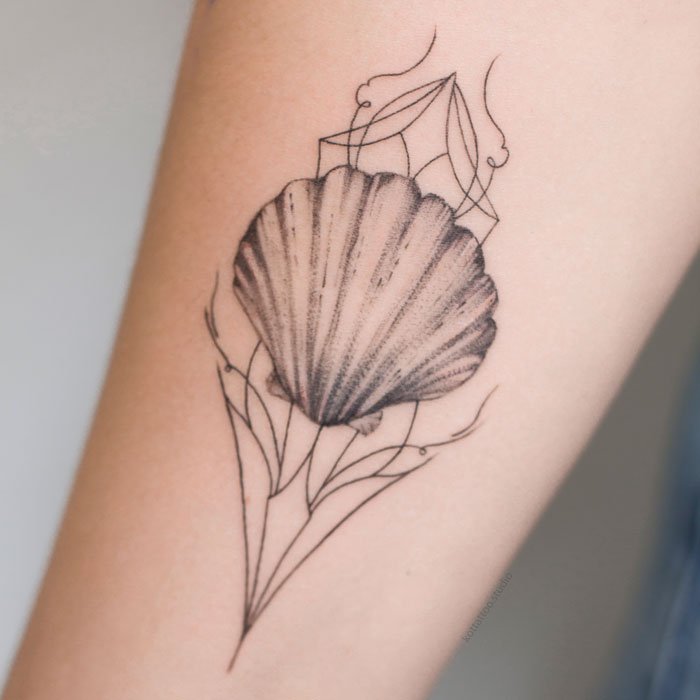 Das Muschel Tattoo kann in jedem Stil ausgeführt werden: Realismus, Aquarell, Dotwork und viele mehr. Bei der Auswahl einer Tattoo-Schale kann die Skizze auf verschiedene Teile des Körpers aufgetragen werden, aber die beliebtesten sind: Arme, Unterarm, Beine, Schulterblatt.
