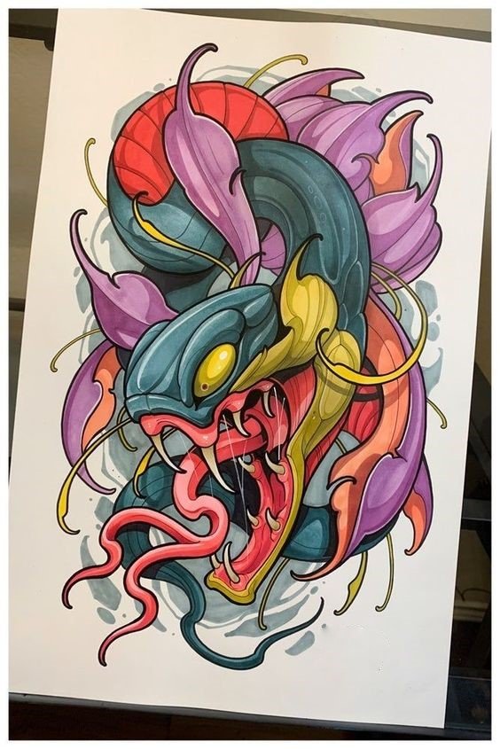 Die Bilder in diesem Stil sind umfangreich und sie ähneln sich dem Graffiti an den Wänden. Bei der Erstellung einer Vorlage im New School Stil kann der Tätowierer frei improvisieren und phantasieren, denn in diesem Stil gibt es volle Wahlfreiheit. Es gibt keine Einschränkungen hinsichtlich der Farbe. Sie können verschiedene Töne verwenden. Am meisten bevorzugt sind jedoch helle, giftige Farbtöne.