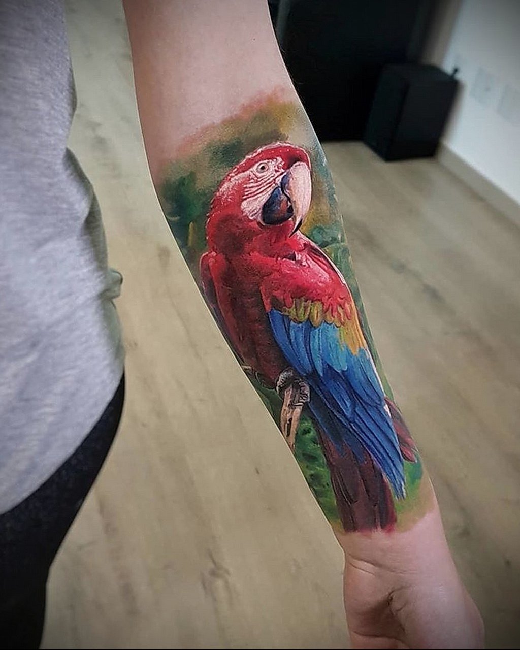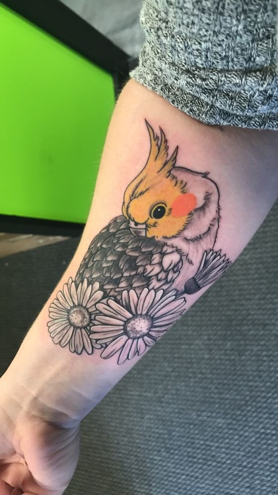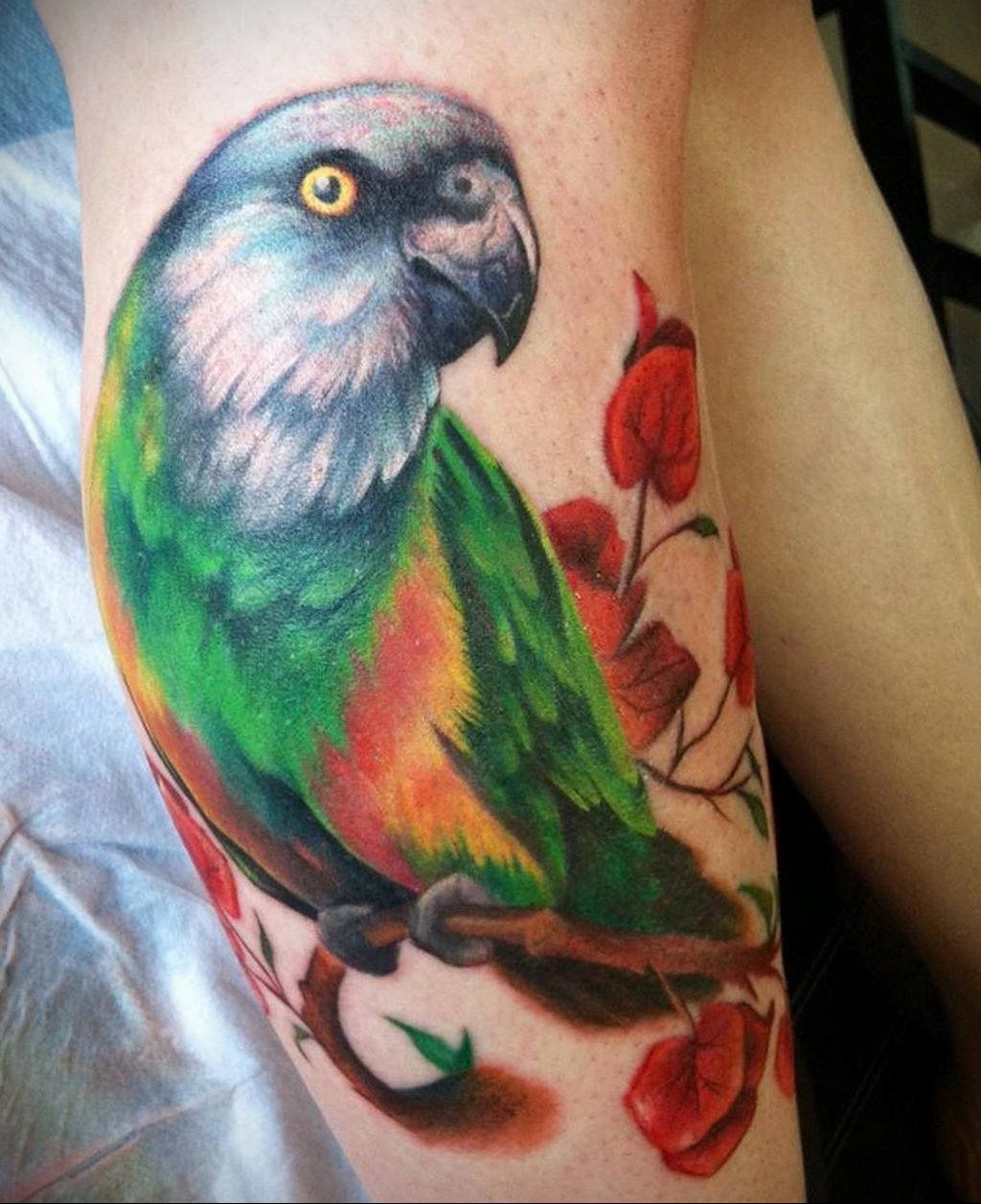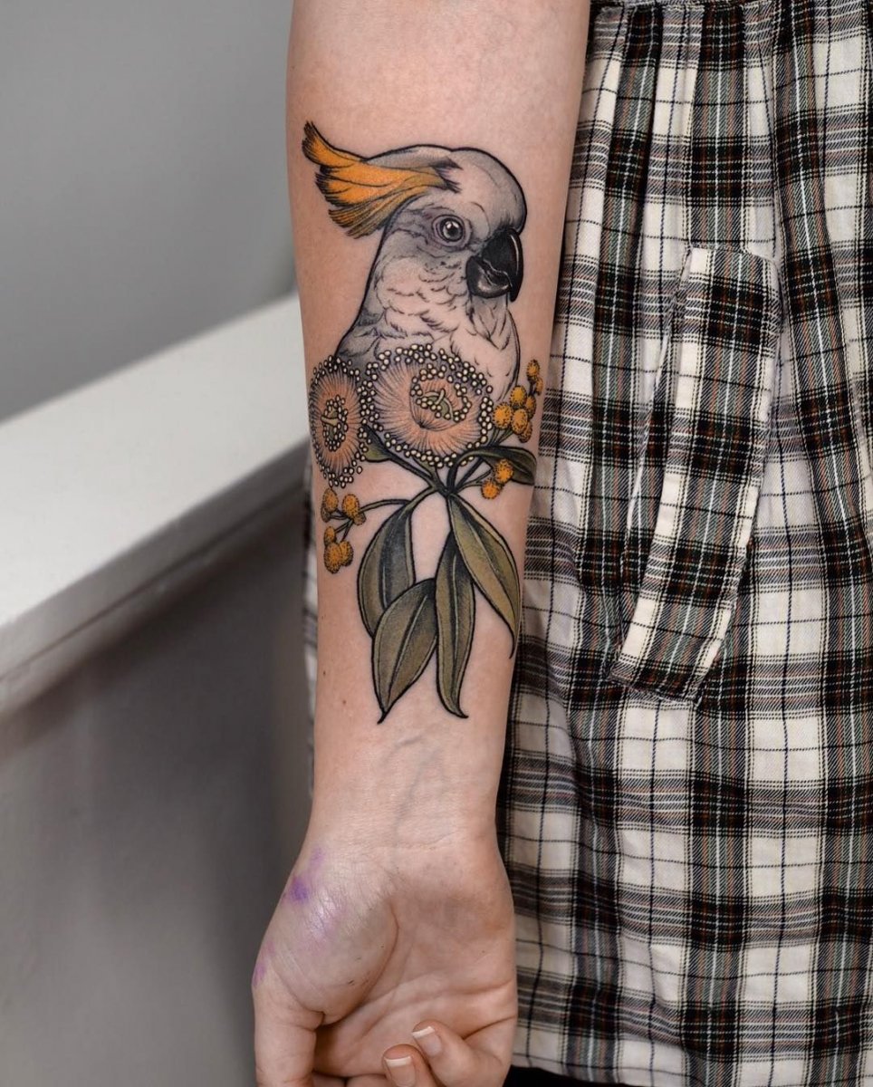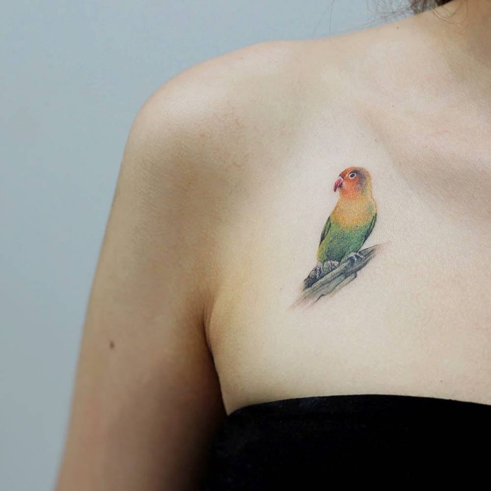 Die Orte zum Auftragen können sehr unterschiedlich sein, aber die beliebtesten Anwendungen des Papageienbildes auf dem Körper sind: Hals, Arm, Rücken, Unterarm.