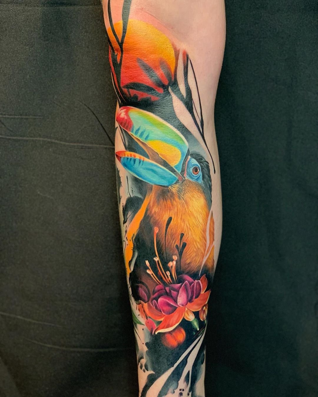 Er ist der am weiteste verbreitete exotische Vogel und wird daher sehr häufig in Form von Körperkunst dargestellt. Die Papageien-Tattoo-Skizze wird in leuchtenden Farben ausgeführt, wobei eine Vielzahl von verschiedenen Farben verwendet wird.