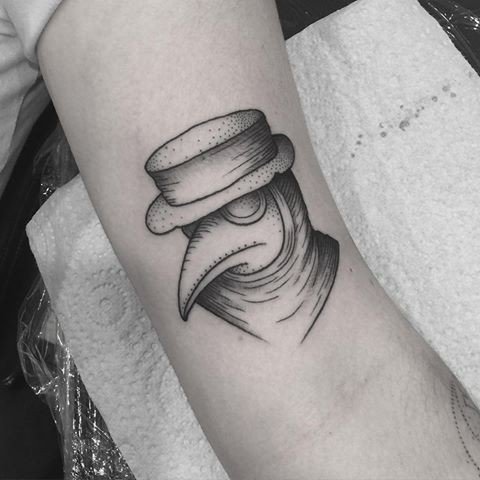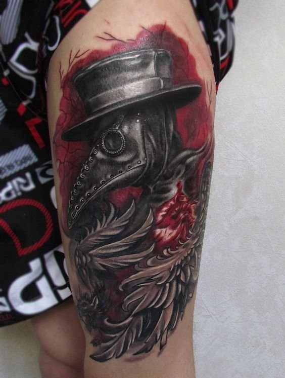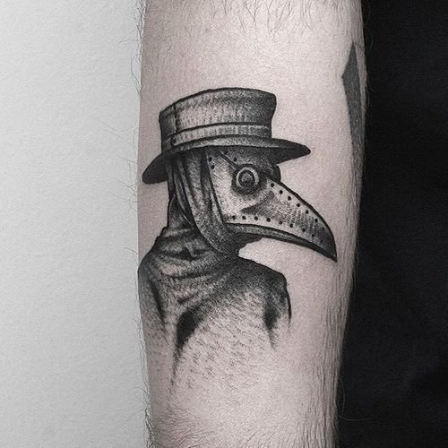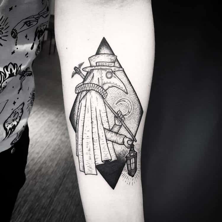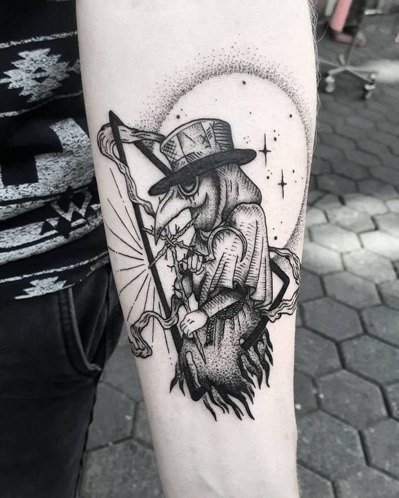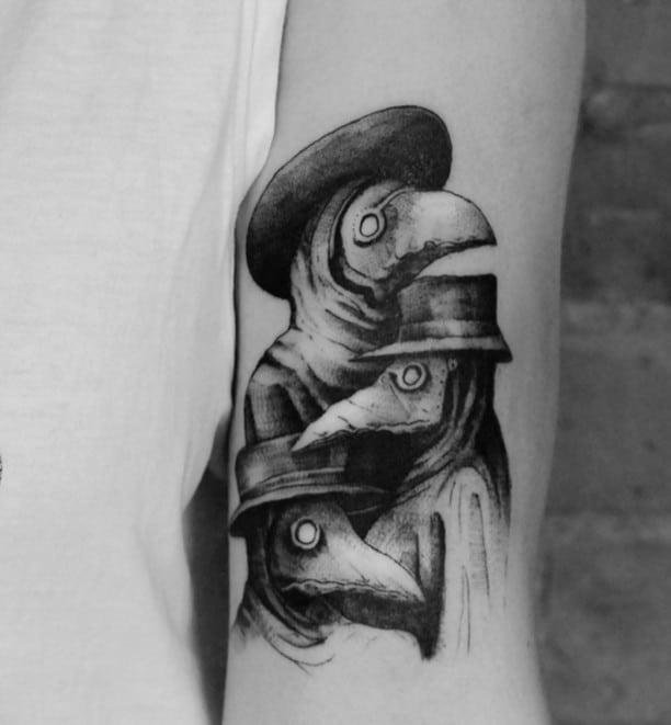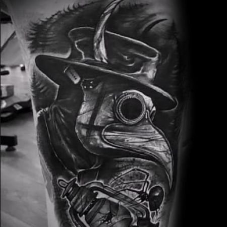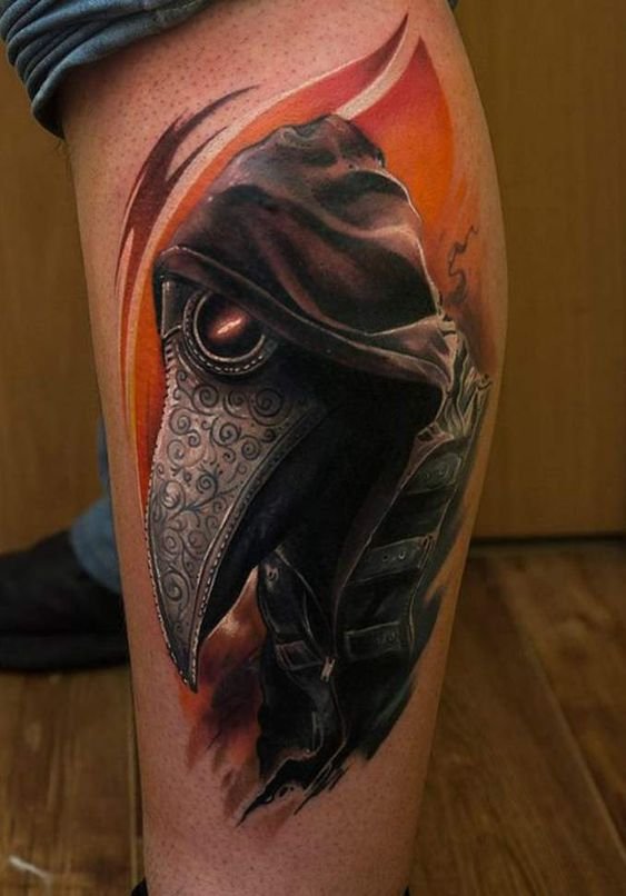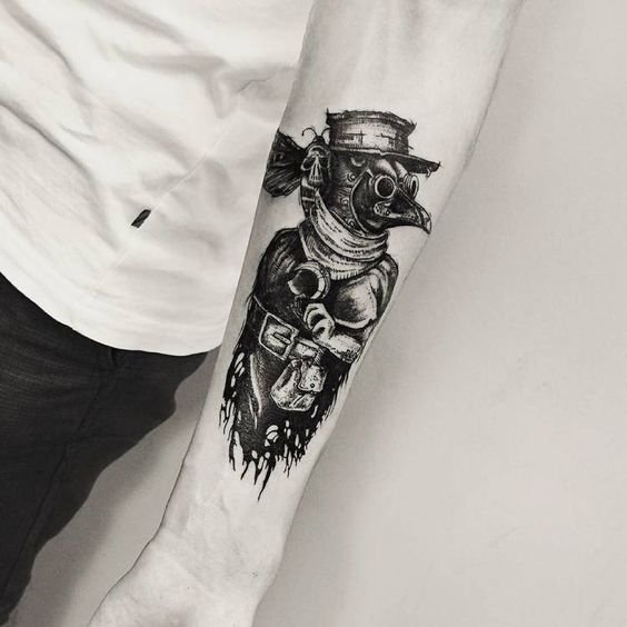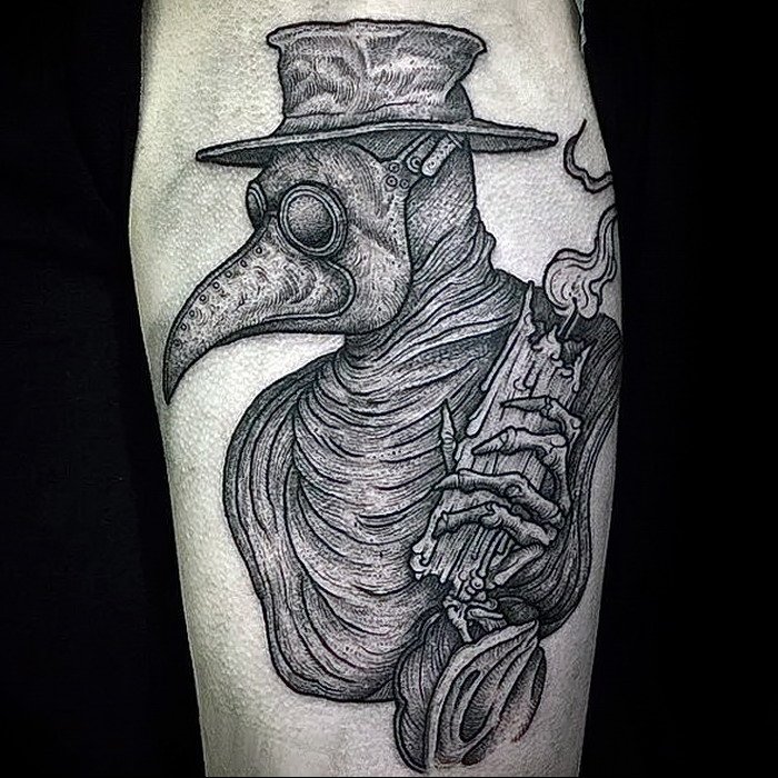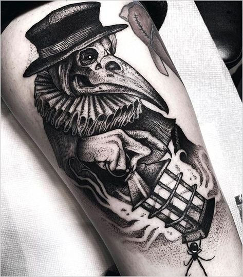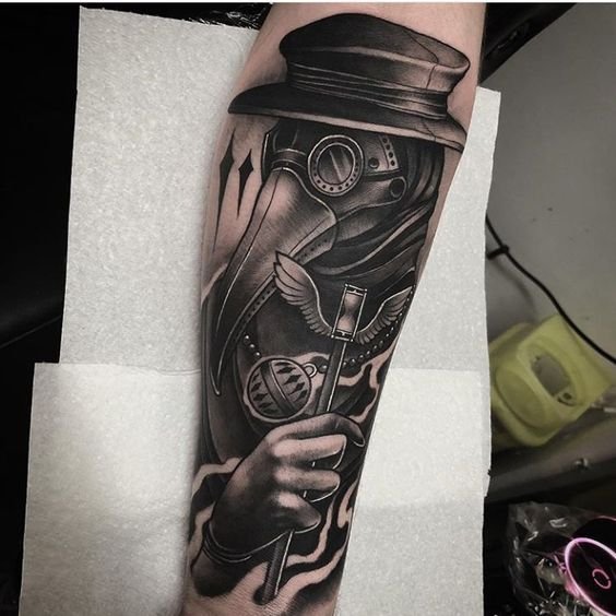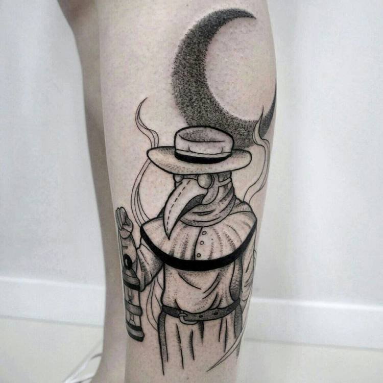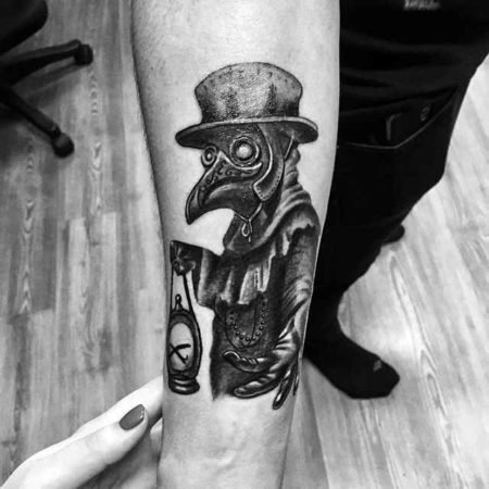 Der Pestarzt ist allen wegen seines ungewöhnlichen Kostüms bekannt, dass die Ärzte des Mittelalters vor der gefürchteten Beulenpest schützte. Während des Mittelalters hat die Pest eine große Anzahl von Menschenleben zerstört. Und so ungewöhnlich, mystische Kostüm Ärzte, war für sie die einzige Rettung vor dem Tod. Der Pestdoktor ist in der Tattoo-Branche gerade wegen seines seltsamen Kostüms so beliebt, das die Leute erschreckt.
