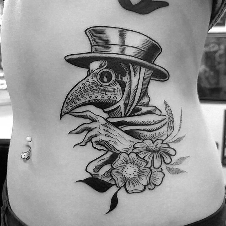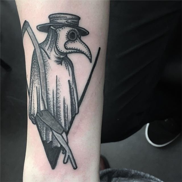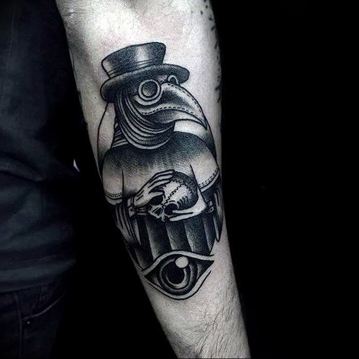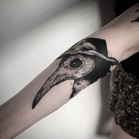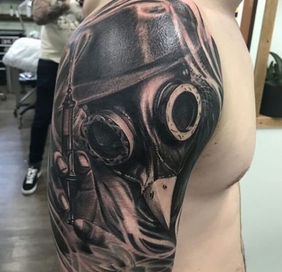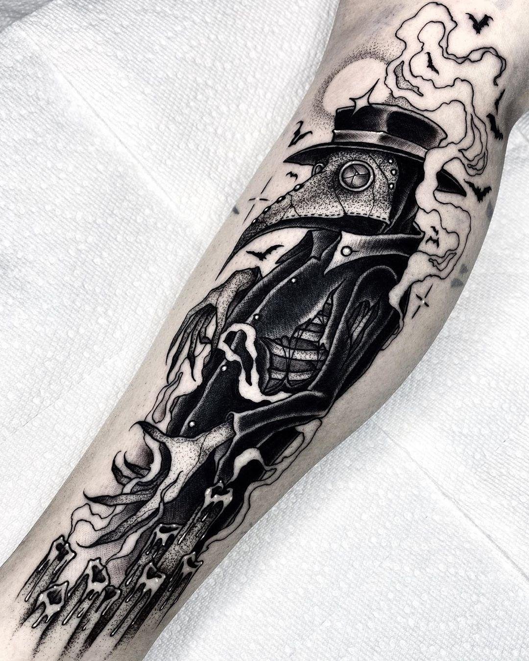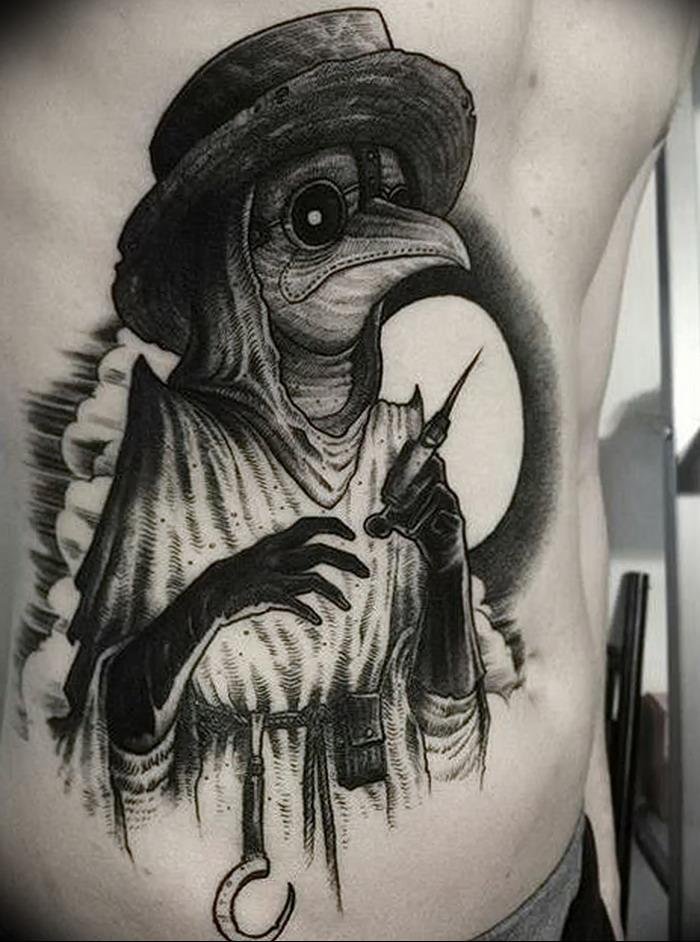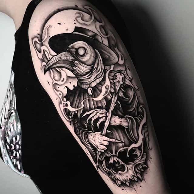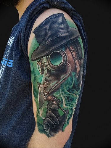 Der Pestarzt ist allen wegen seines ungewöhnlichen Kostüms bekannt, dass die Ärzte des Mittelalters vor der gefürchteten Beulenpest schützte. Während des Mittelalters hat die Pest eine große Anzahl von Menschenleben zerstört. Und so ungewöhnlich, mystische Kostüm Ärzte, war für sie die einzige Rettung vor dem Tod. Der Pestdoktor ist in der Tattoo-Branche gerade wegen seines seltsamen Kostüms so beliebt, das die Leute erschreckt.