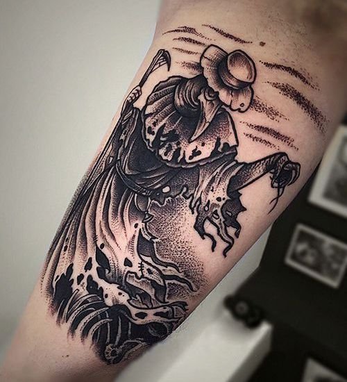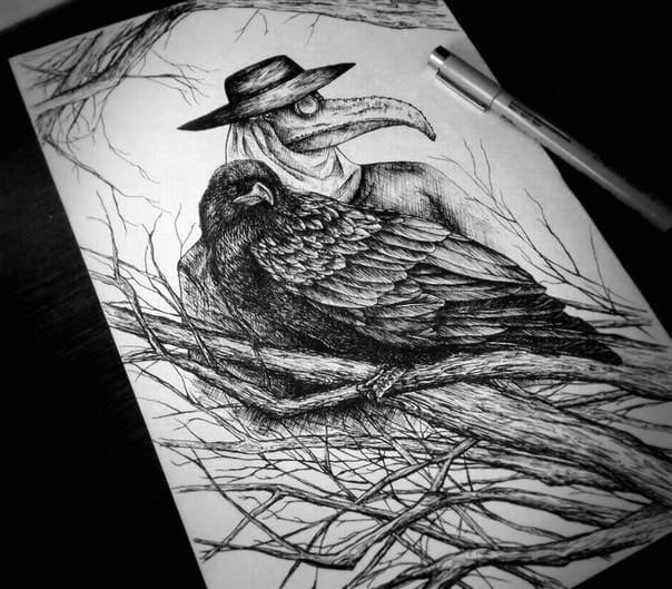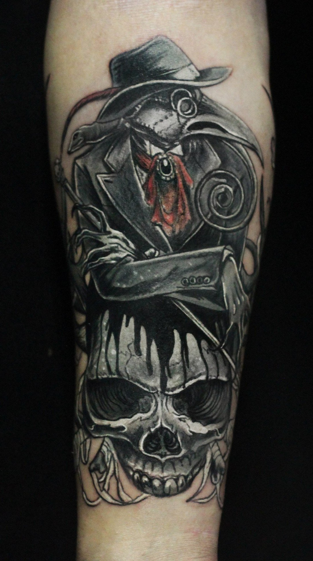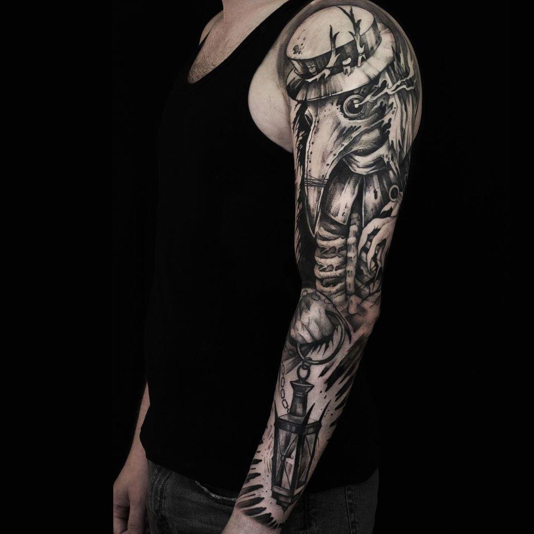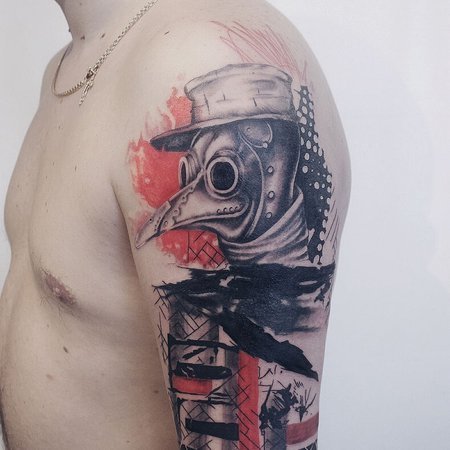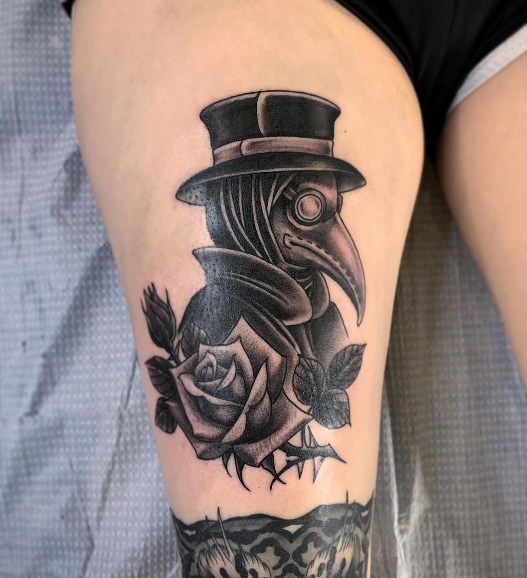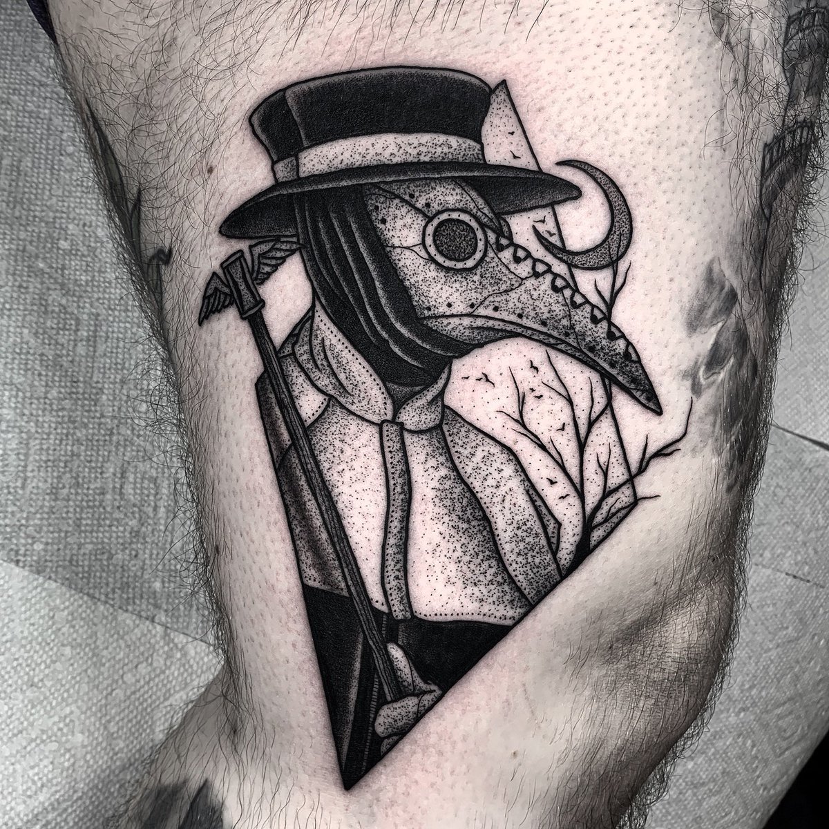 Der Pestarzt ist allen wegen seines ungewöhnlichen Kostüms bekannt, dass die Ärzte des Mittelalters vor der gefürchteten Beulenpest schützte. Während des Mittelalters hat die Pest eine große Anzahl von Menschenleben zerstört. Und so ungewöhnlich, mystische Kostüm Ärzte, war für sie die einzige Rettung vor dem Tod. Der Pestdoktor ist in der Tattoo-Branche gerade wegen seines seltsamen Kostüms so beliebt, das die Leute erschreckt.