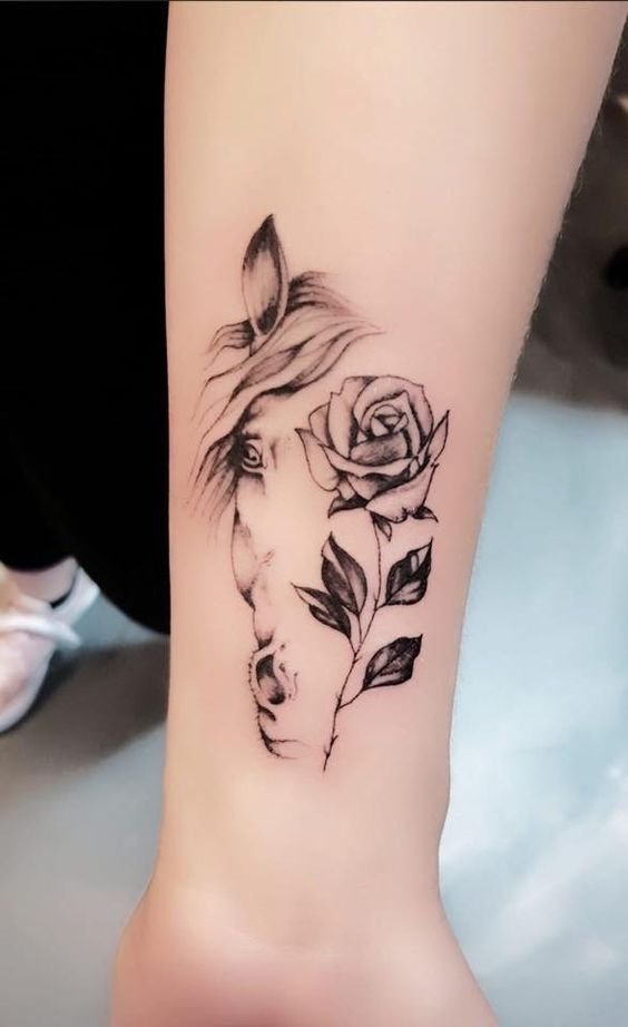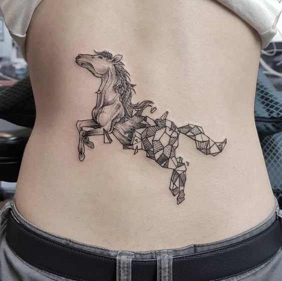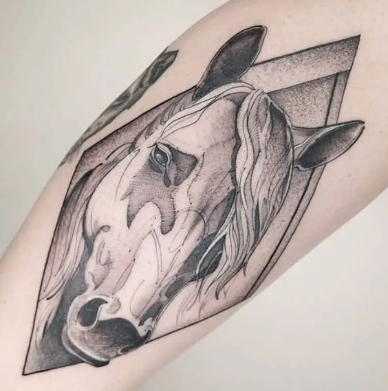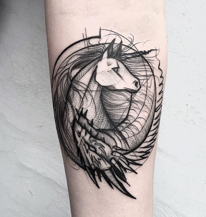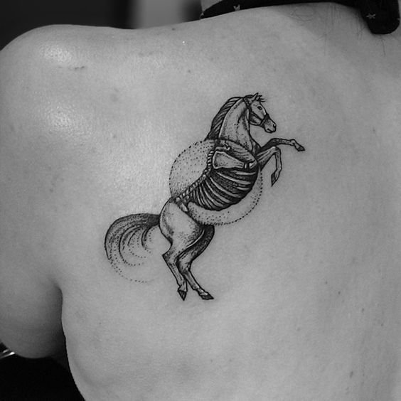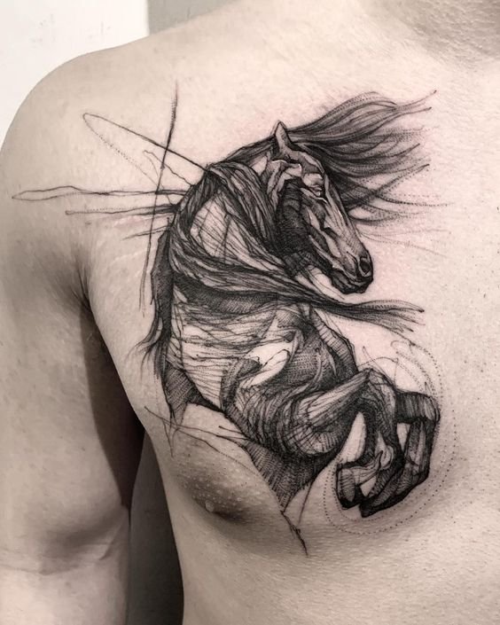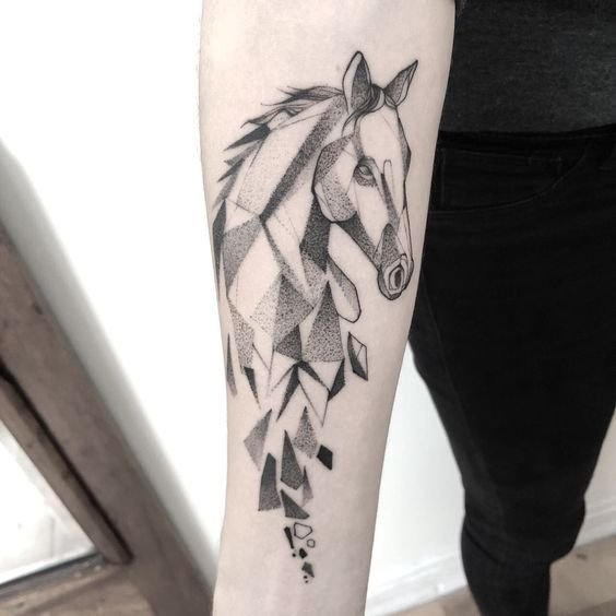 - Ein Pferd, das in einem schematischen Bild ausgeführt wird, ist eine Seltenheit, dieses Tattoo zeigt, dass sein Besitzer eine sehr originelle und interessante Persönlichkeit ist.