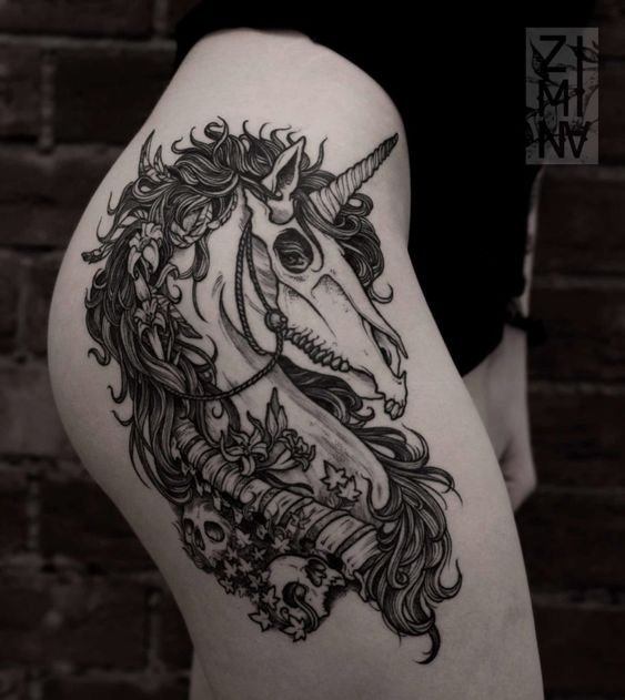- Ein wenig beängstigend sieht das Tattoo mit dem Schädel des Pferdes aus, aber es trägt nur positive Eigenschaften, ein solches Bild dient als Amulett für seinen Besitzer.