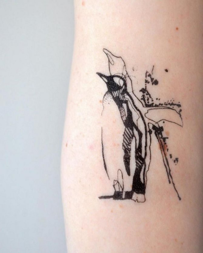 Der Pinguin hat nicht viele Farbschattierungen, aber durch seine zurückhaltende Farbgebung ist er ein Zeichen für die reiche innere Welt eines Menschen. Viele Menschen assoziieren den Pinguin mit Zurückhaltung, mit der Fähigkeit, ungeachtet der Umstände Freundlichkeit zu zeigen, und mit der Fähigkeit, einen Wutanfall zu unterdrücken. Nur ein Tattoo mit dem Bild eines Pinguins behandelt die Energie und Unermüdlichkeit des Besitzers dieser Zeichnung.