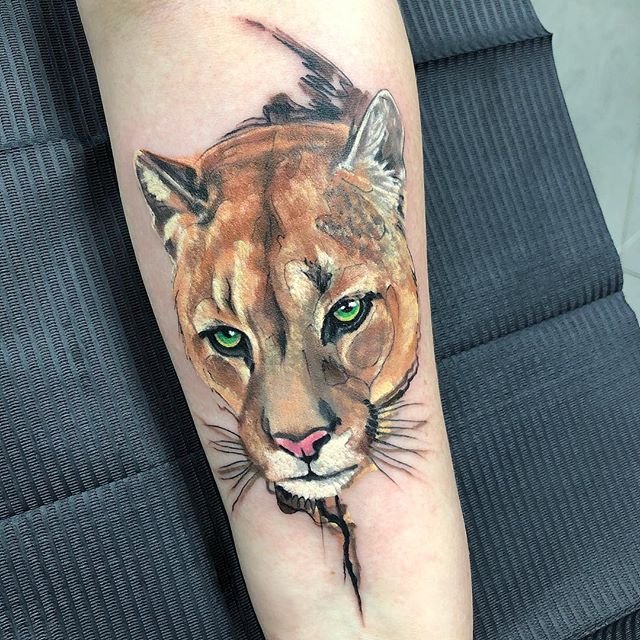 Wenn es sich um einen Puma in vollem Wachstum in seiner ganzen Pracht handelt, wird der beste Ort für seine Anwendung großflächige Bereiche des Körpers sein: Rücken, Brust. Wenn wir über den Kopf des Tieres sprechen, sind solche Körperteile wie der Unterarm, die Schulter, der obere Teil des Beines durchaus geeignet.