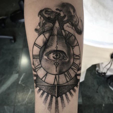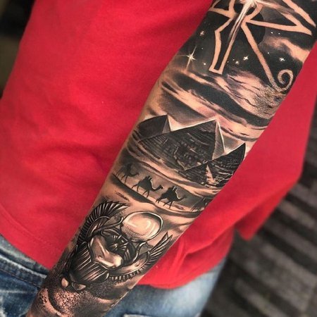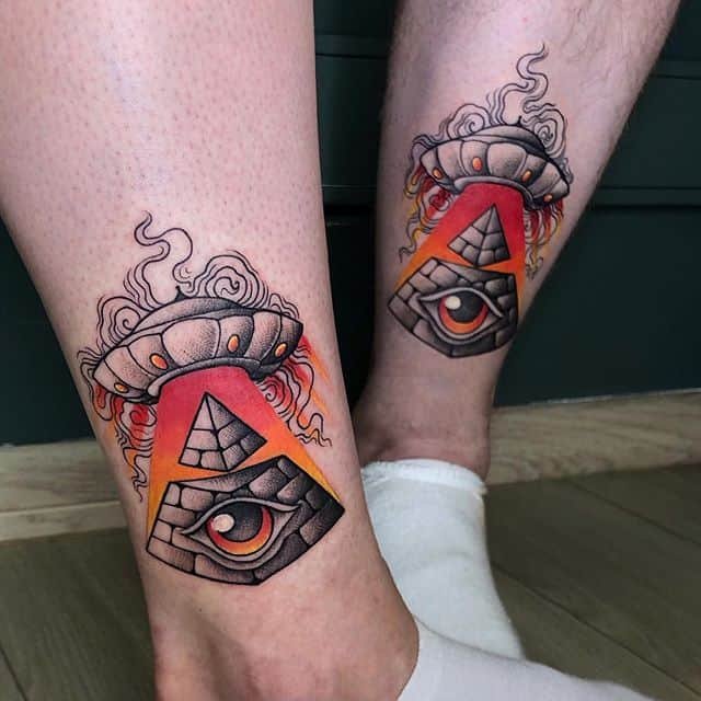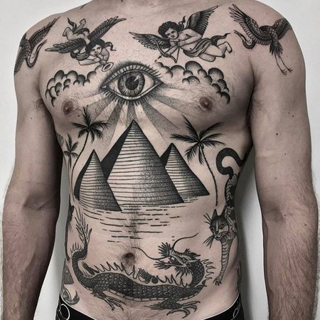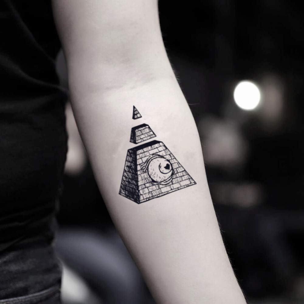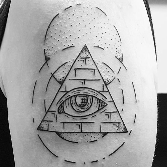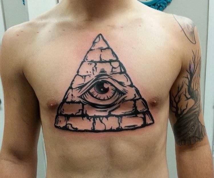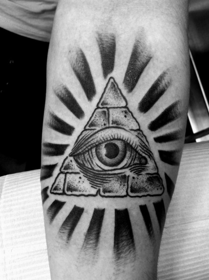 - Eine andere Bezeichnung für dieses Bild ist das allsehende Auge. In der Regel verwendet die Tätowierung das Bild des Auges von Gott Ra (Sonnengott), sowie es gibt zusätzliche Elemente (Bäume, Pflanzen, Sonnenstrahlen). Oft befindet sich in der Pyramide ein Abbild anderer Pyramiden. Diese Tätowierung ist eine mächtige Verbindung zwischen einer Person und der Kraft der Erde, und ist auch ein Amulett, das den Träger vor allem Schlechten schützt.