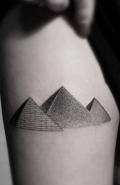- Diese Interpretation ist mit der Tatsache verbunden, dass in den Pyramiden zusammen mit den Pharaonen all ihren Reichtum begraben wurden. Daher wird oft das Tattoo der Pyramide auf ihren Körper aufgetragen, als Zeichen der Gewinnung von materiellem Wohl.