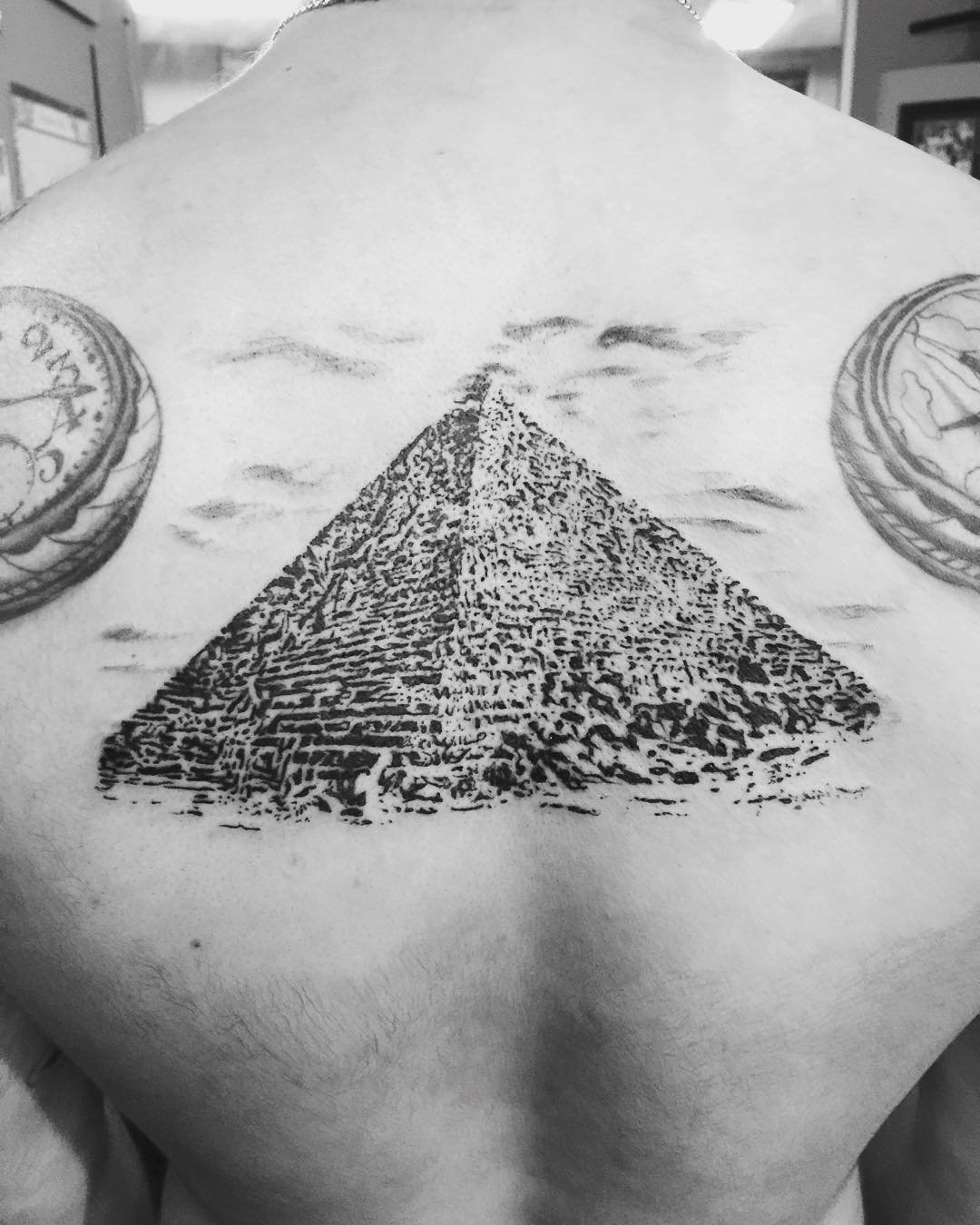 - Das Bild der Pyramide kann über den Wunsch des Besitzers nach spiritueller Entwicklung sprechen. Auch diese Zeichnung auf dem Körper charakterisiert eine Person als kreative Persönlichkeit.