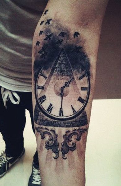 Die Pyramide ist in der Regel auf der Schulter, dem Rücken und der Handfläche abgebildet. Auch am Handgelenk ist die Struktur häufig zu sehen, meist bei Frauen. Die Tätowierung wird sowohl in Schwarz-Weiß als auch in Farbe ausgeführt. In diesem Fall kann das Bild realistisch sein oder in einem beliebigen Stil erstellt werden. Es hängt alles von den Wünschen des Kunden und der Phantasie des Tätowierers ab.