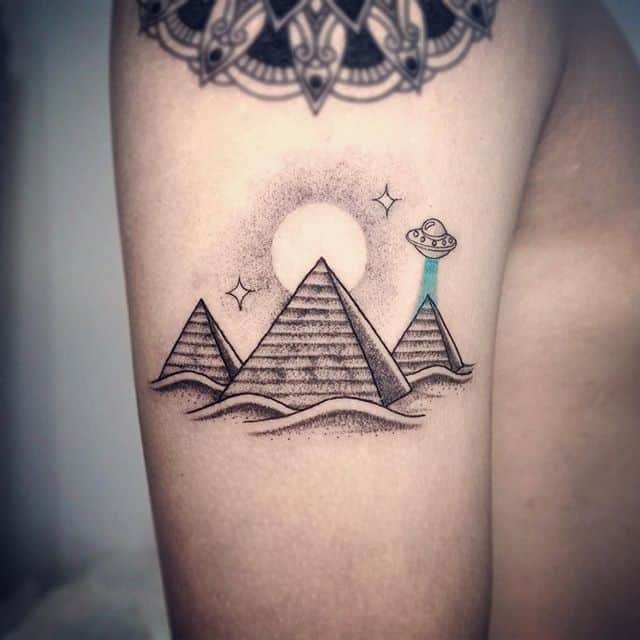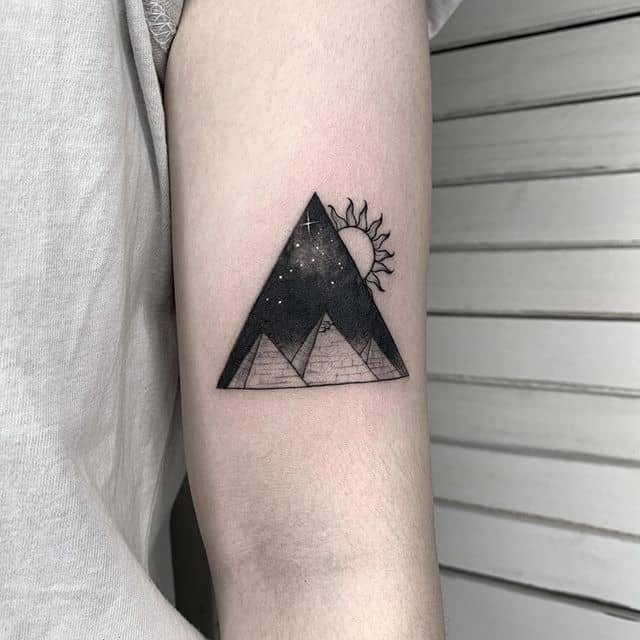 Die alten Ägypter betrachteten Pyramiden als Symbole der Sonne und als Ausdruck des ewigen Lebens der Pharaonen. Diese majestätischen Bauwerke sind auch mit dem Element Feuer verbunden und tragen eine tiefe, kraftvolle Botschaft, weshalb sie häufig im Bereich der Tätowierung verwendet werden. Ein Pyramiden-Tattoo kann verschiedene Bedeutungen haben, darunter das Streben nach Selbstentfaltung, Perfektion, Wissen und Können. Es symbolisiert Reichtum und wird oft als Glücksbringer für Wohlstand angesehen.