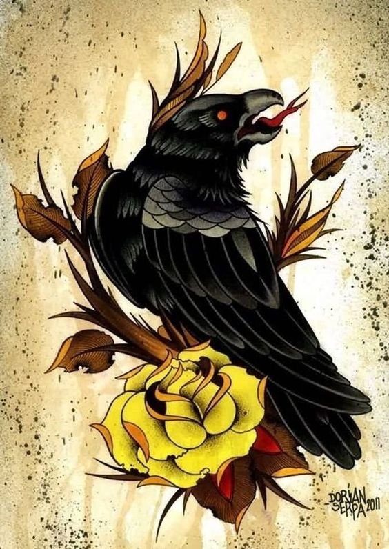 Es wird vermutet, dass diese Vertreter der Vögel ungefähr dreihundert Jahre alt werden können, so dass ihr Bild oft mit einem langen Leben und sogar mit der Ewigkeit verbunden ist. Die Person, deren Körper das Bild dieses Vogels schmückt, wird gewöhnlich mit Vorsicht behandelt, da diese Vögel seit der Antike nicht die Sympathie der Menschen erregt haben, sondern im Gegenteil als Vorbote des Bösen angesehen wurden. Heute trägt eine Tattoo-Skizze einer Krähe mehrere Interpretationen, sowohl positiv als auch nicht sehr angenehm. Sie bezeichnen normalerweise Weisheit, Langlebigkeit und Einsamkeit. In den
