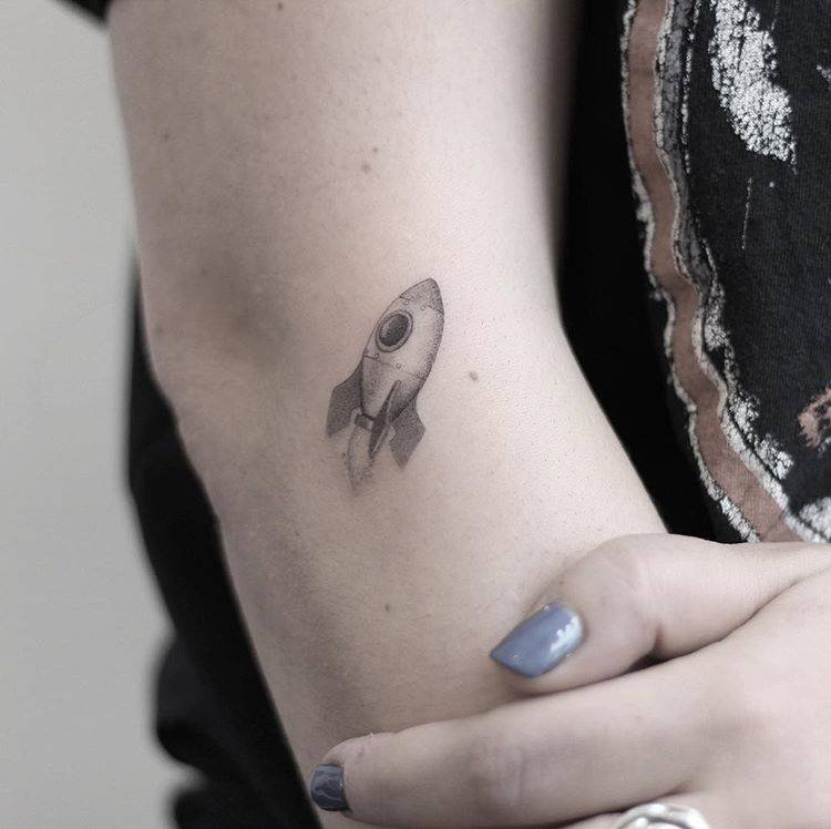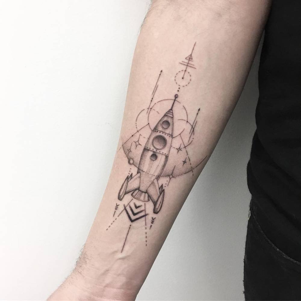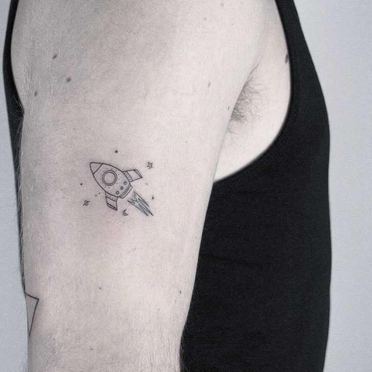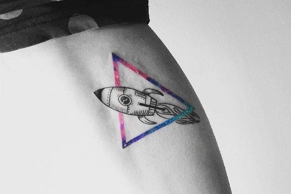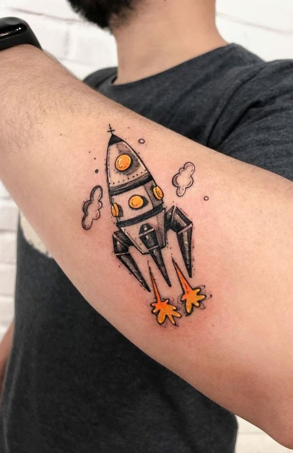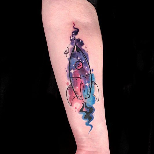 Tattoo Rakete geeignet für Männer, die in ihren Fähigkeiten und Fähigkeiten überzeugt sind, sowie sich selbst und andere motivieren, viele Projekte zu machen und damit neue Höhen zu erobern. Das Bild einer Rakete weist auch auf den übermächtigen Charakter einer Person hin und darauf, dass äußere Faktoren keinen Einfluss auf ihre Handlungen und Taten haben.