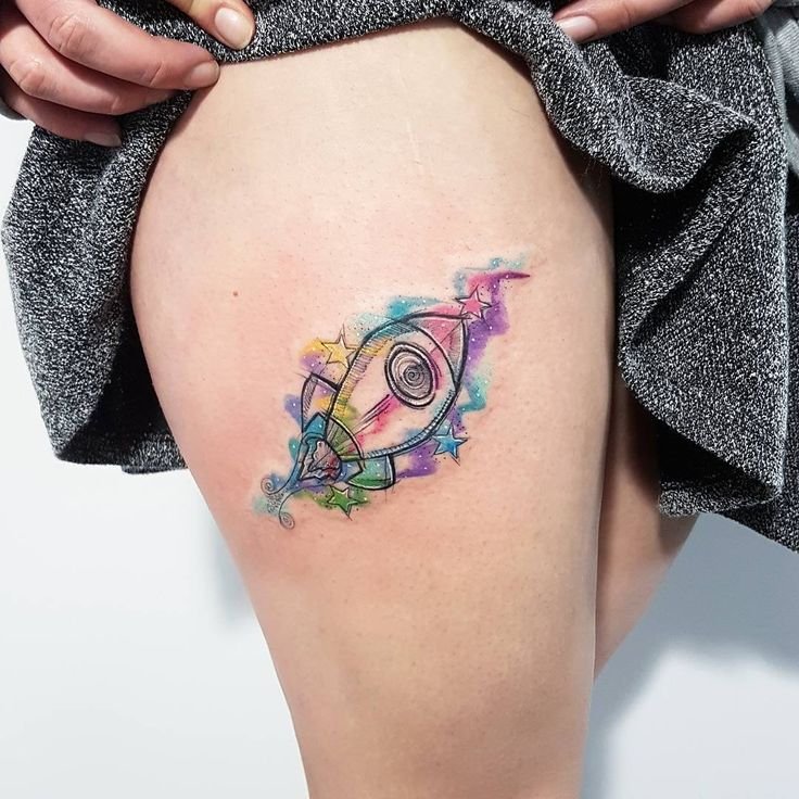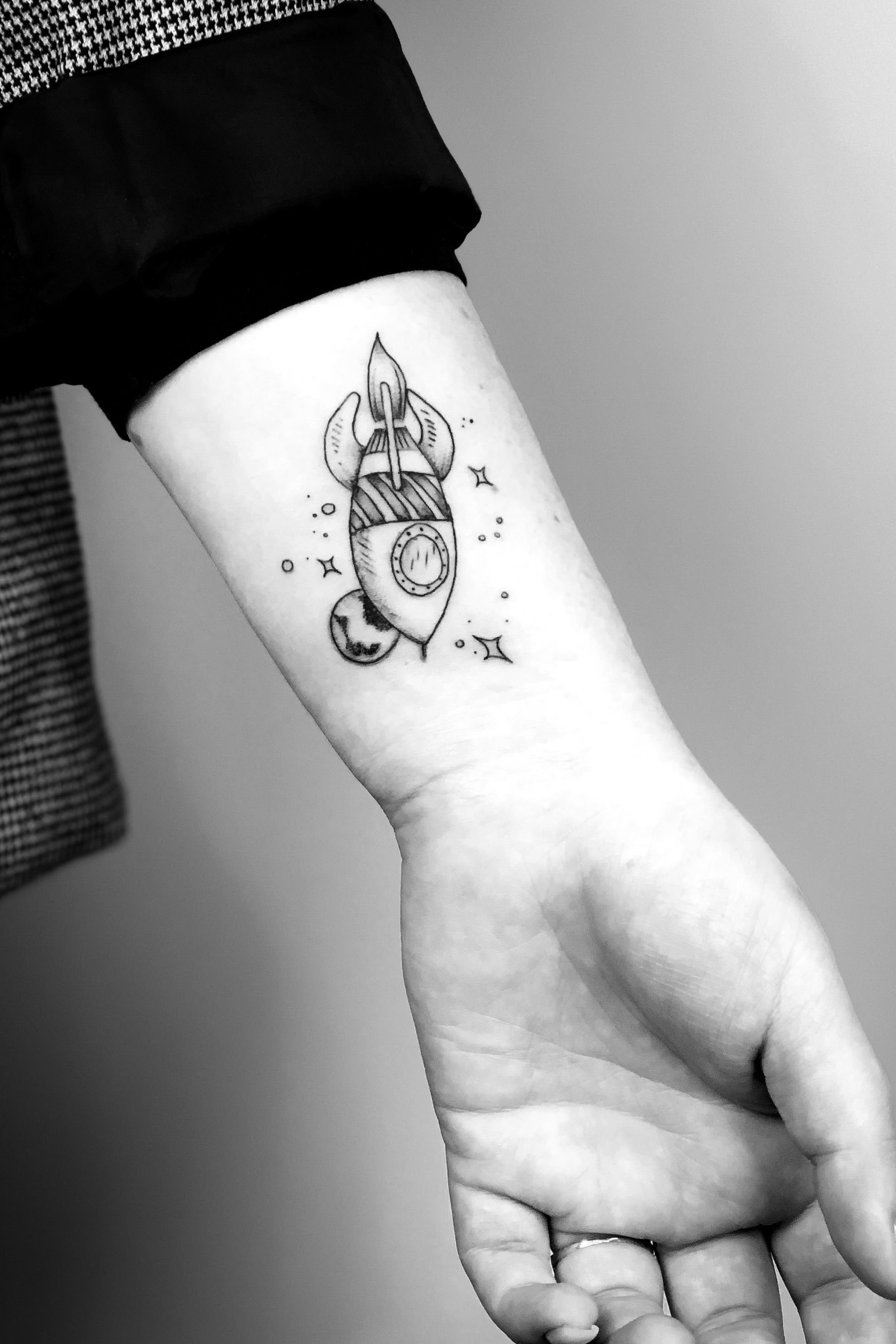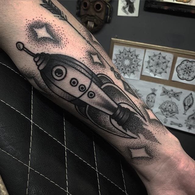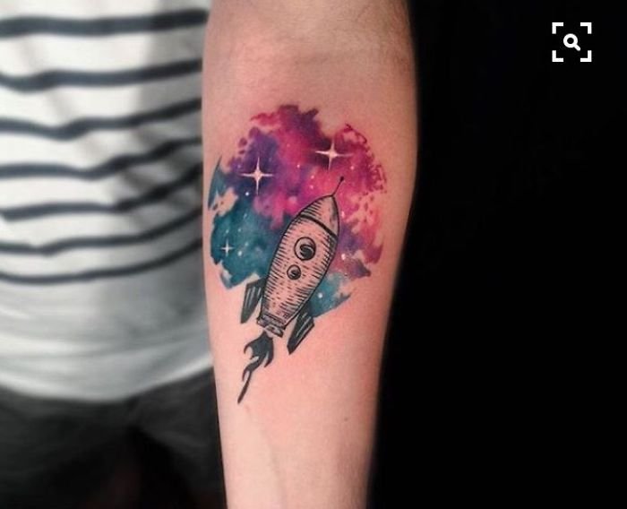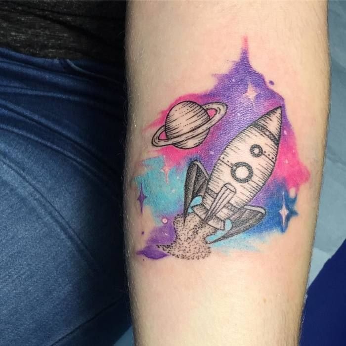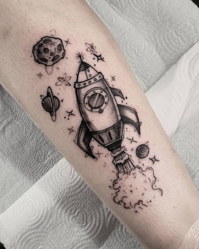 Tattoo Rakete geeignet für Männer, die in ihren Fähigkeiten und Fähigkeiten überzeugt sind, sowie sich selbst und andere motivieren, viele Projekte zu machen und damit neue Höhen zu erobern. Das Bild einer Rakete weist auch auf den übermächtigen Charakter einer Person hin und darauf, dass äußere Faktoren keinen Einfluss auf ihre Handlungen und Taten haben.