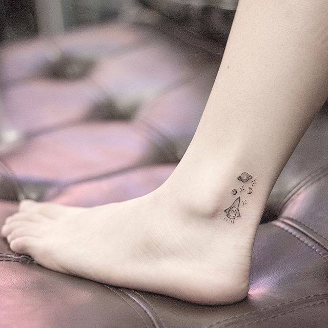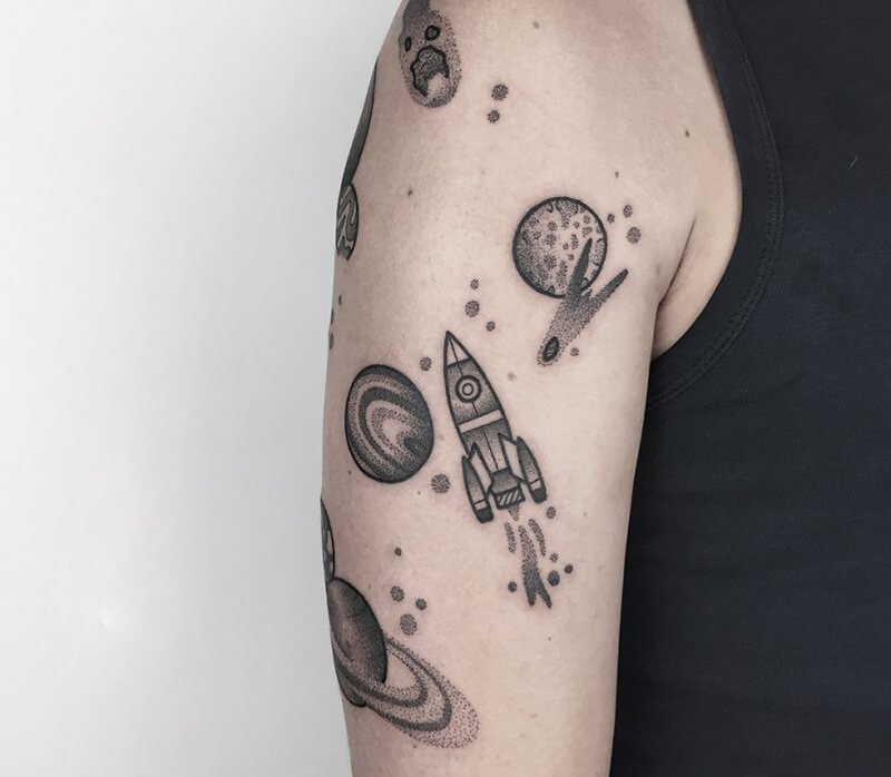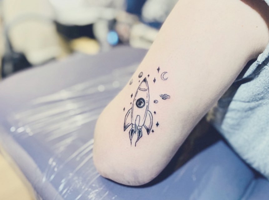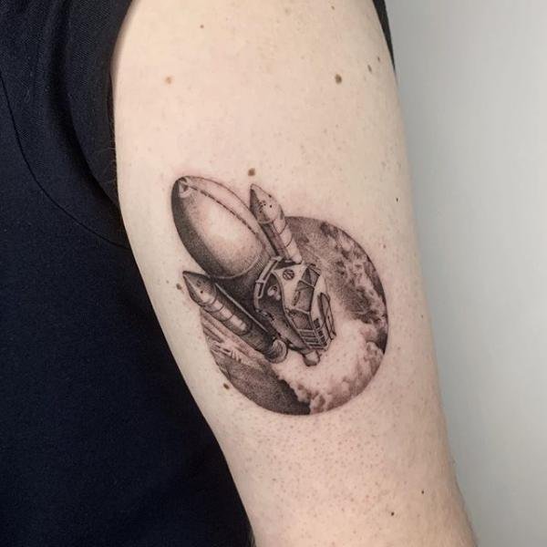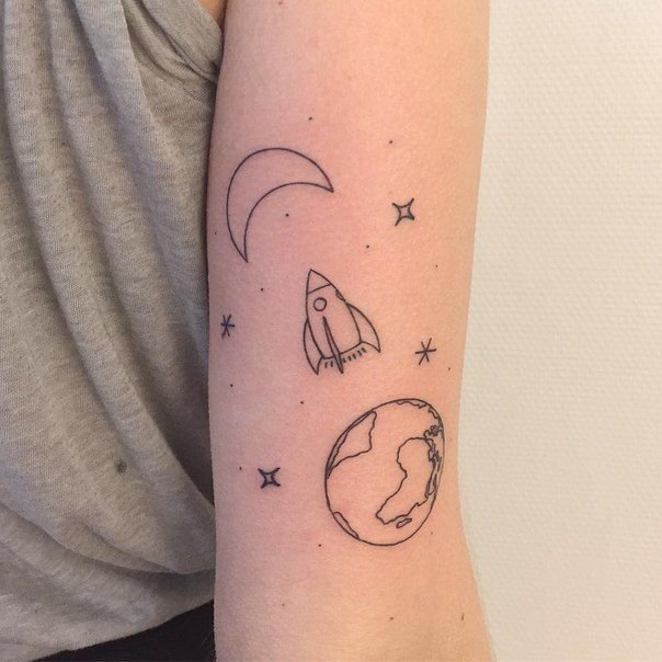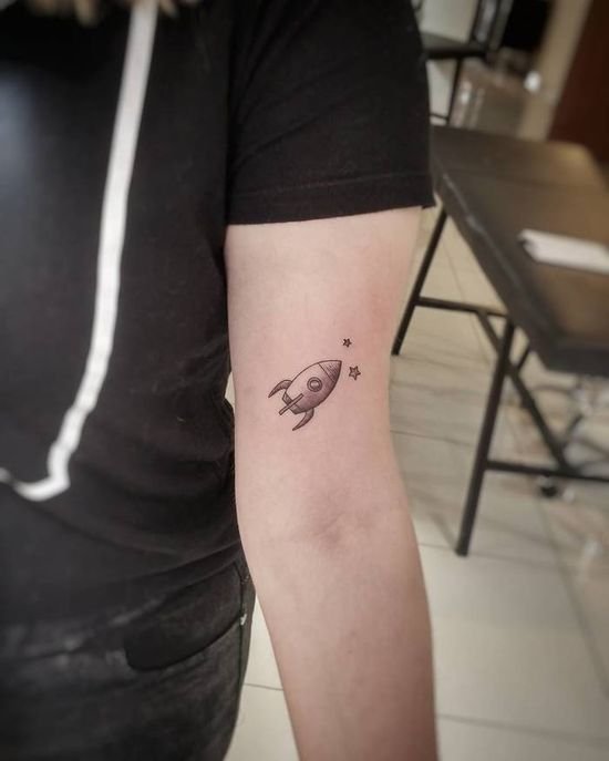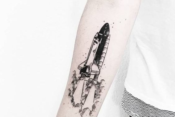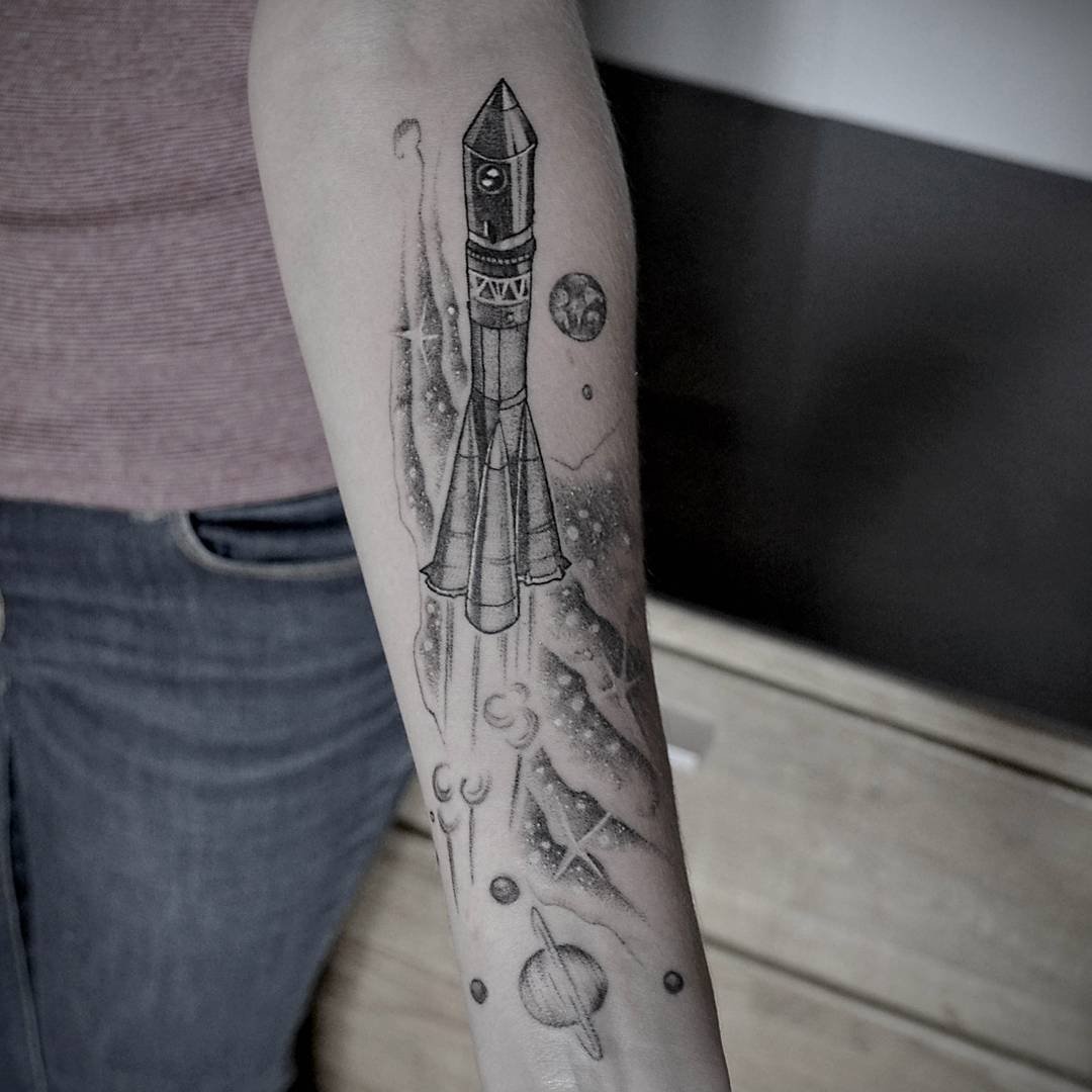 Die Tätowierung kann mit Porträts großer Kosmonauten wie Yuri Gagarin oder German Titov einzigartig sein. Der Hauptzweck des Entwurfs besteht darin, ein Bild einer Rakete in Form von Graffiti, realistischen oder Cartoon-Stil Tätowierungen zu schaffen.